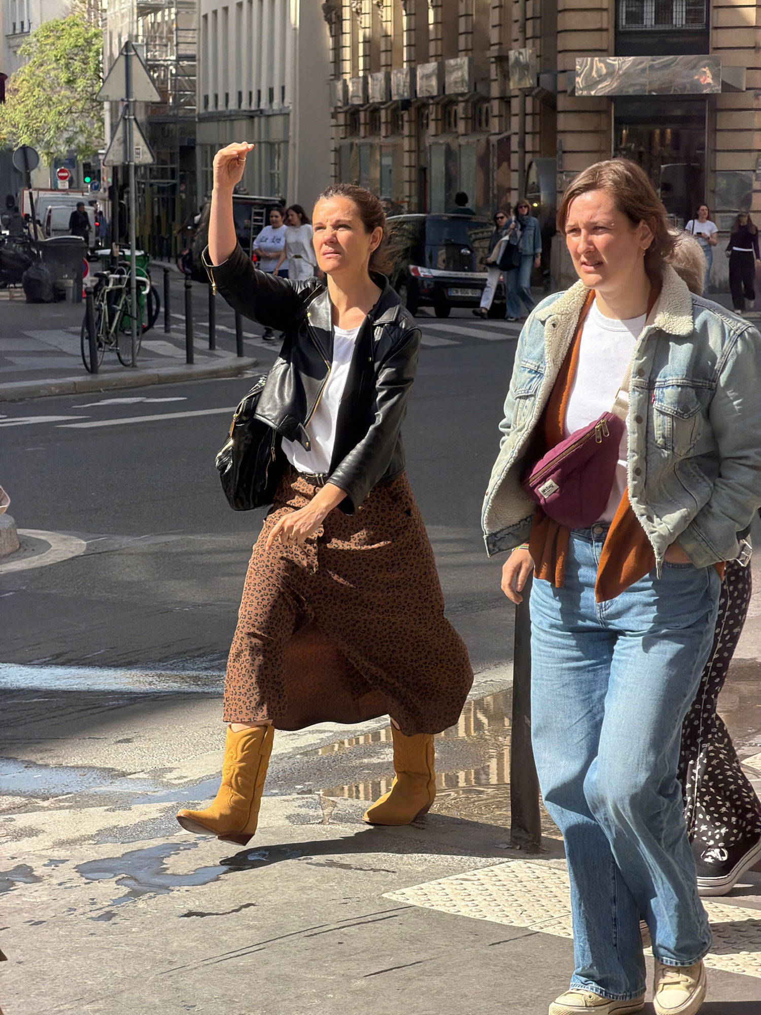 Two women stand together on a sidewalk in Paris, France. The woman on the left wears a black leather jacket, a white t-shirt, a brown patterned skirt, and brown boots. She holds her hand up as if she'…read more