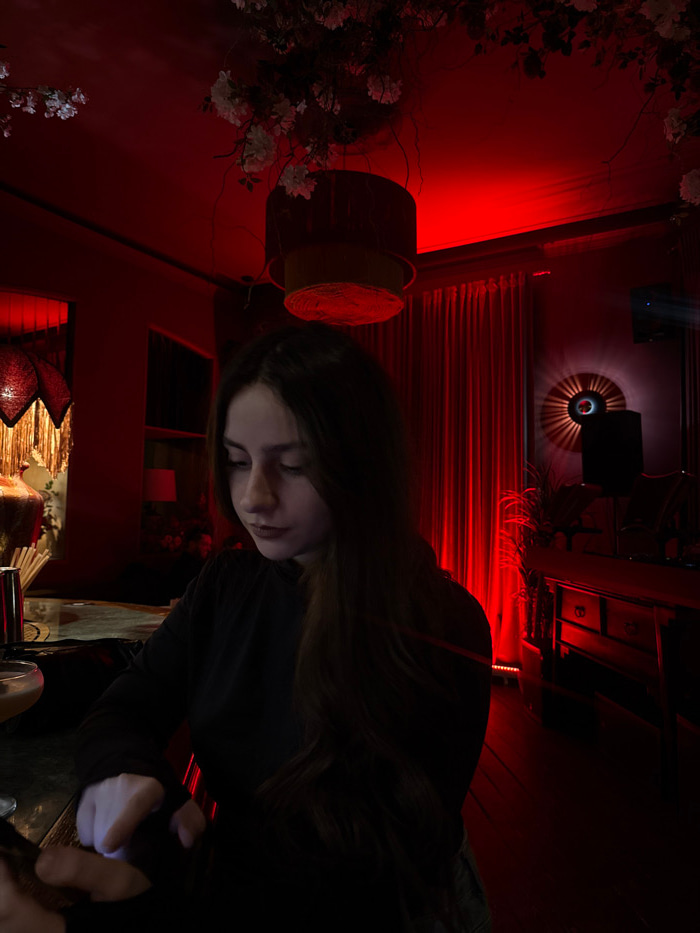 A young female with long, dark brown hair, wearing a dark long-sleeved top, is seated at a dark counter or bar in an indoor setting predominantly illuminated by deep red ambient light. Her head is sli…read more