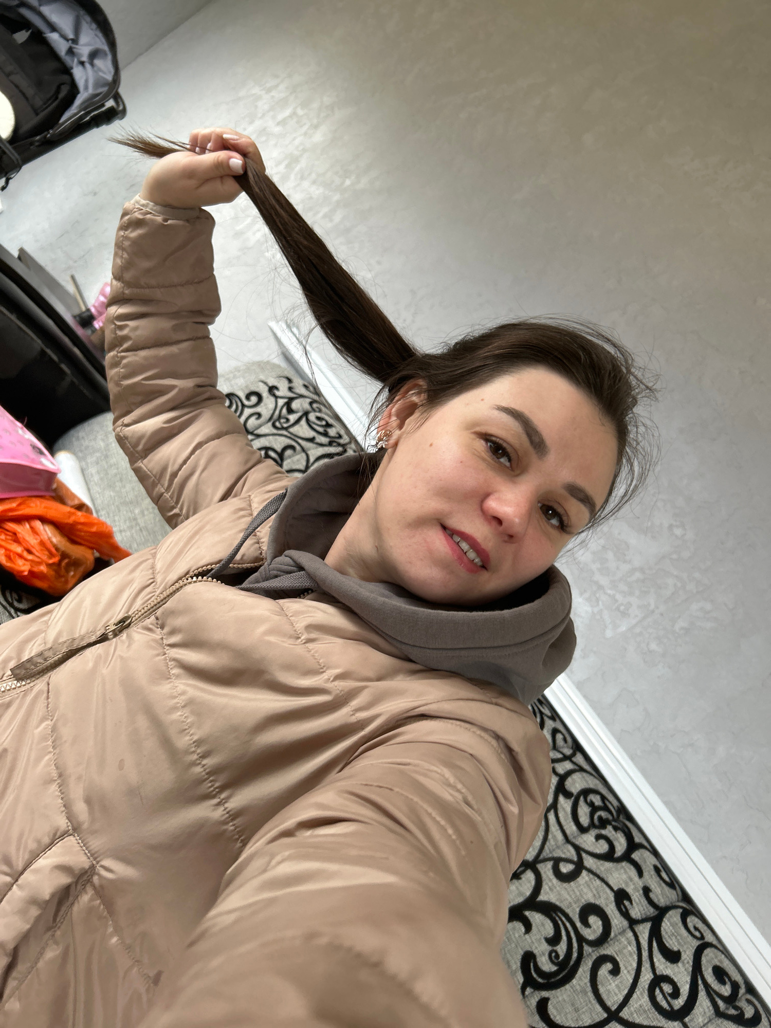 A selfie image shows a woman indoors, holding a section of her dark brown hair in her left hand. She is wearing a beige puffer jacket over a gray hooded sweatshirt. The background includes a gray wall…read more