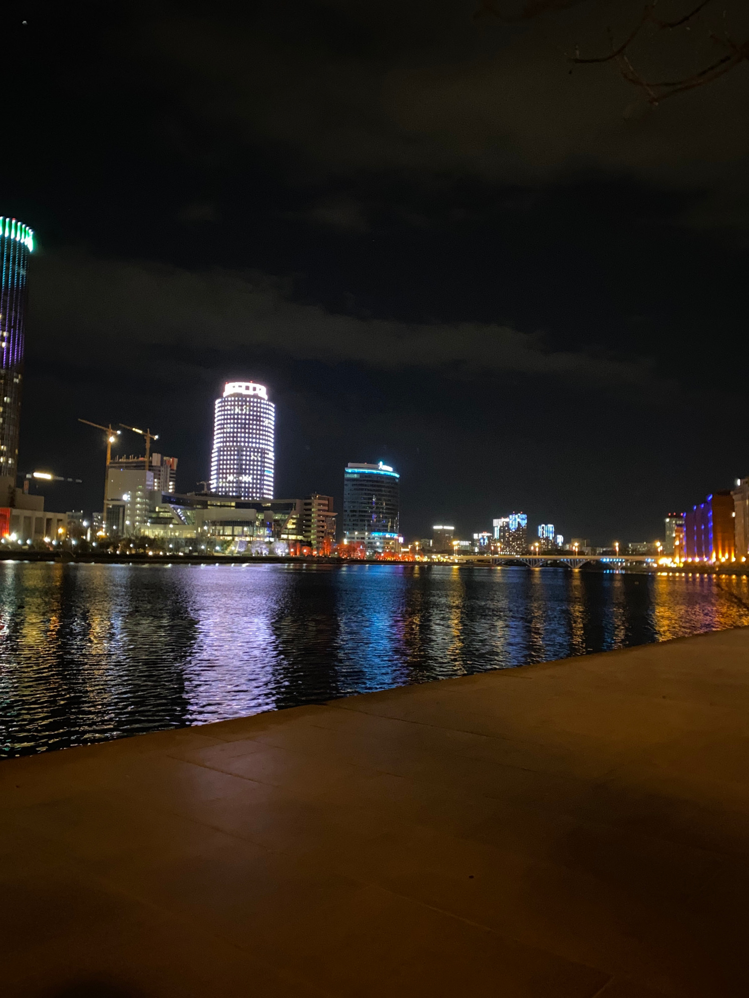 A long exposure photograph showcases a night view of Yekaterinburg, Russia, reflected in a body of water, presumably a river or reservoir. The skyline features multiple lit-up buildings of varying hei…read more