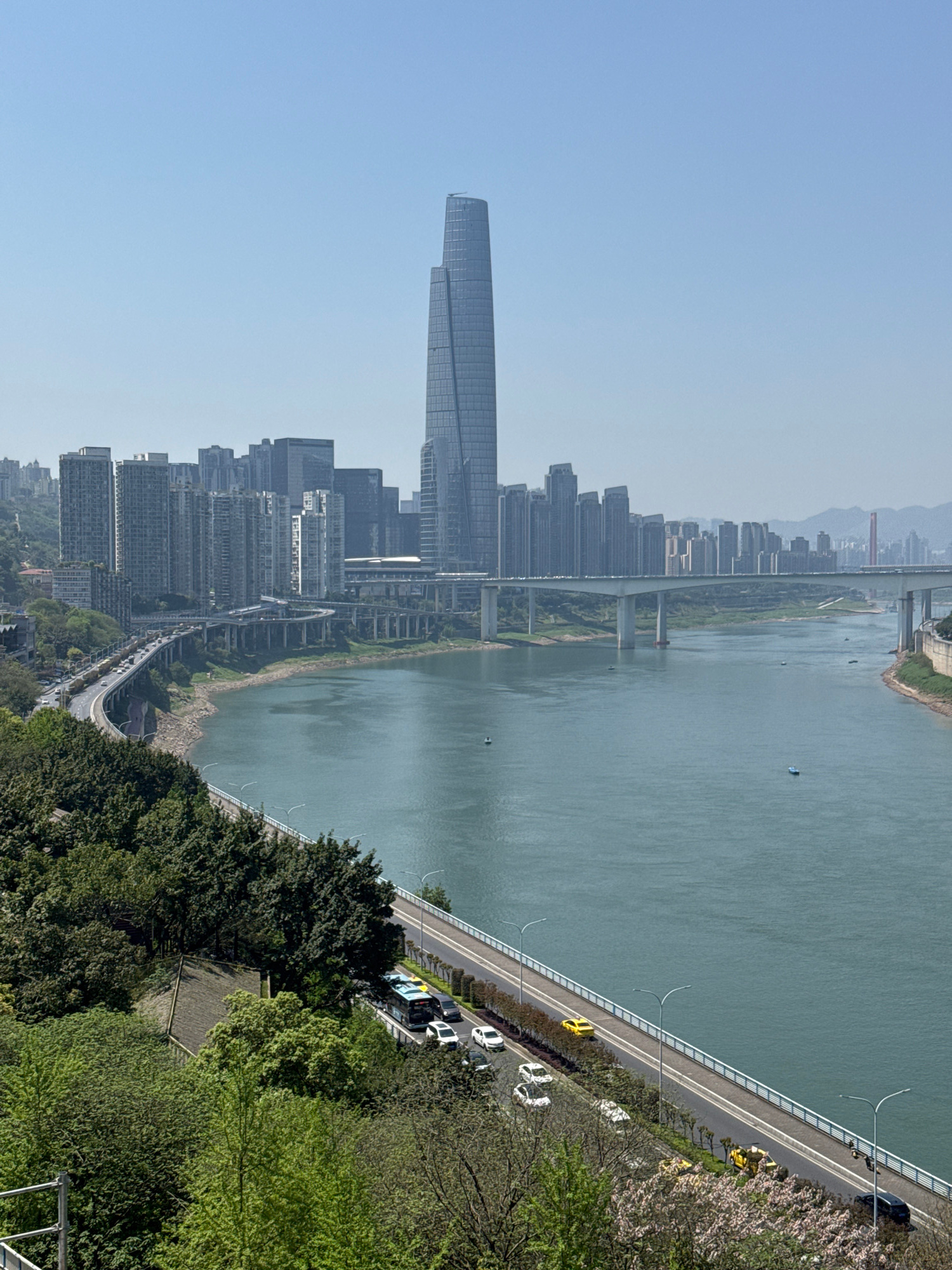 The image depicts a daytime aerial view of the Yuzhong District in Chongqing, China. A large river runs diagonally through the frame, with a bridge spanning it. A modern skyline of tall buildings rise…read more