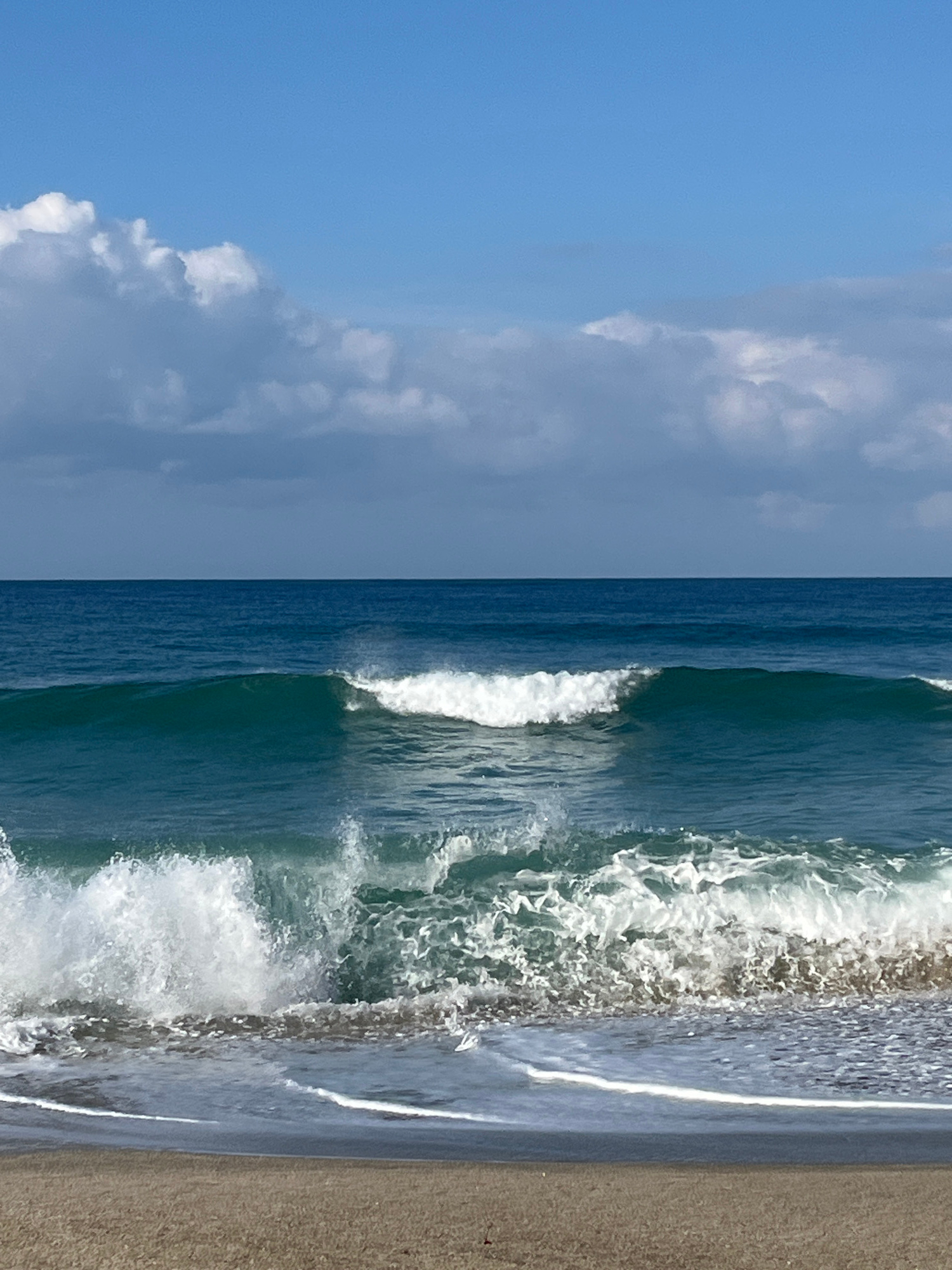 The image displays a daytime view of the Mediterranean Sea from a sandy beach in Alanya, Turkey. The upper half of the frame shows a blue sky with scattered white and grey cumulus clouds, more concent…read more
