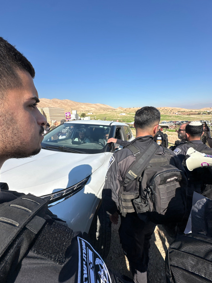 The scene is set outdoors in Ras 'Ein al 'Auja, Palestinian Territory, under a clear blue sky on a sunny day. In the immediate foreground, a male individual is visible in left profile, wearing a dark…read more