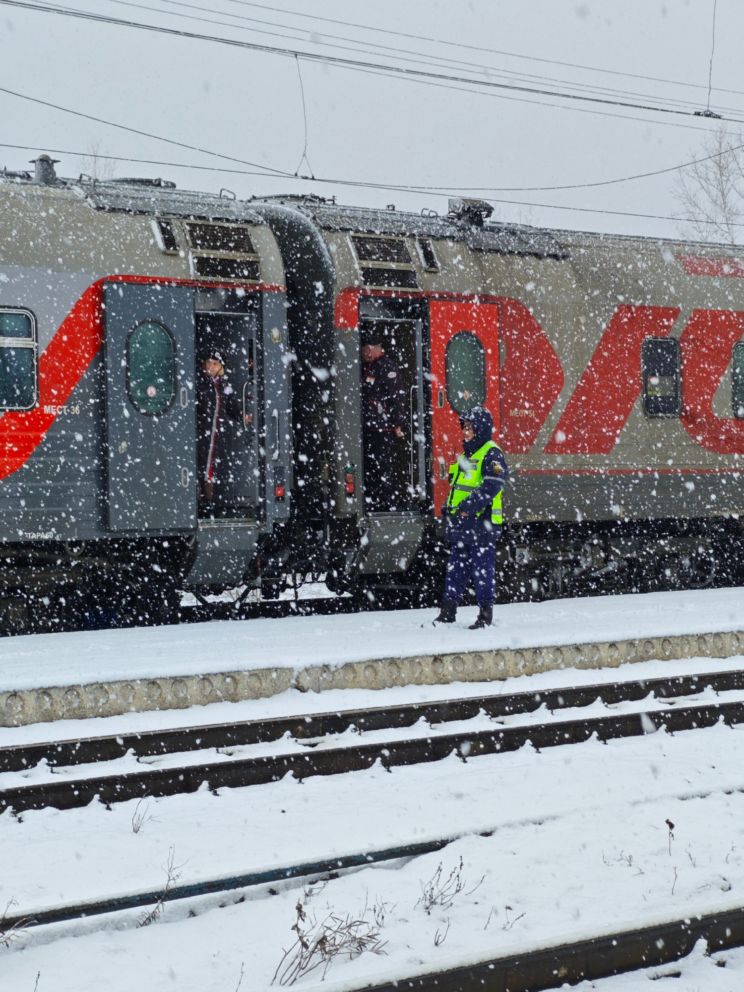 The image captures a snowy scene at what appears to be a train station in Kambarka, Russia. A red and gray Russian Railways (RZD) train is stopped at a platform. Two figures can be seen in the train d…read more