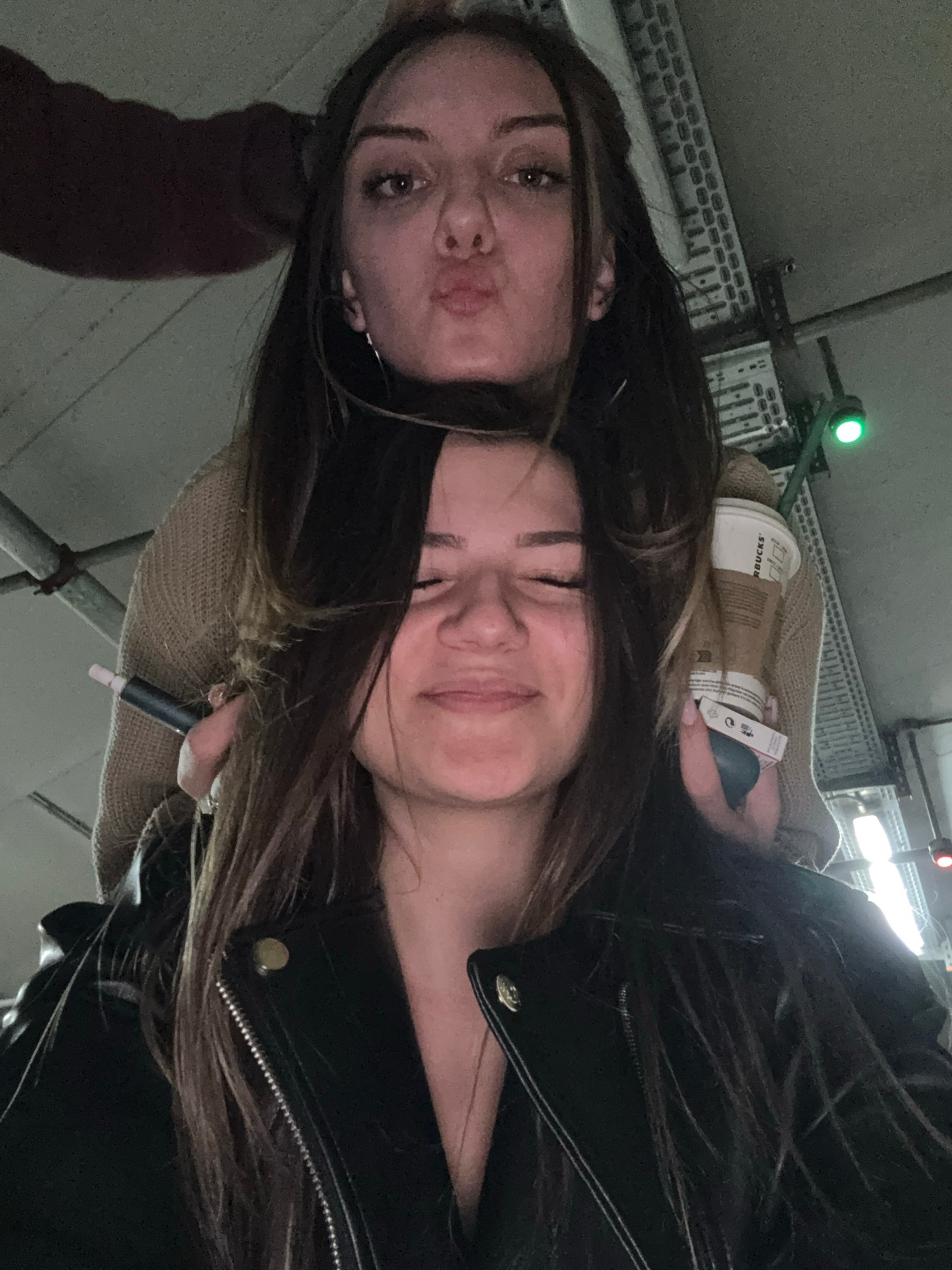 Two young women are posing closely for a selfie. The woman on the left has a pout expression, while the woman on the right is smiling with her eyes closed. The woman on the right is wearing a black le…read more