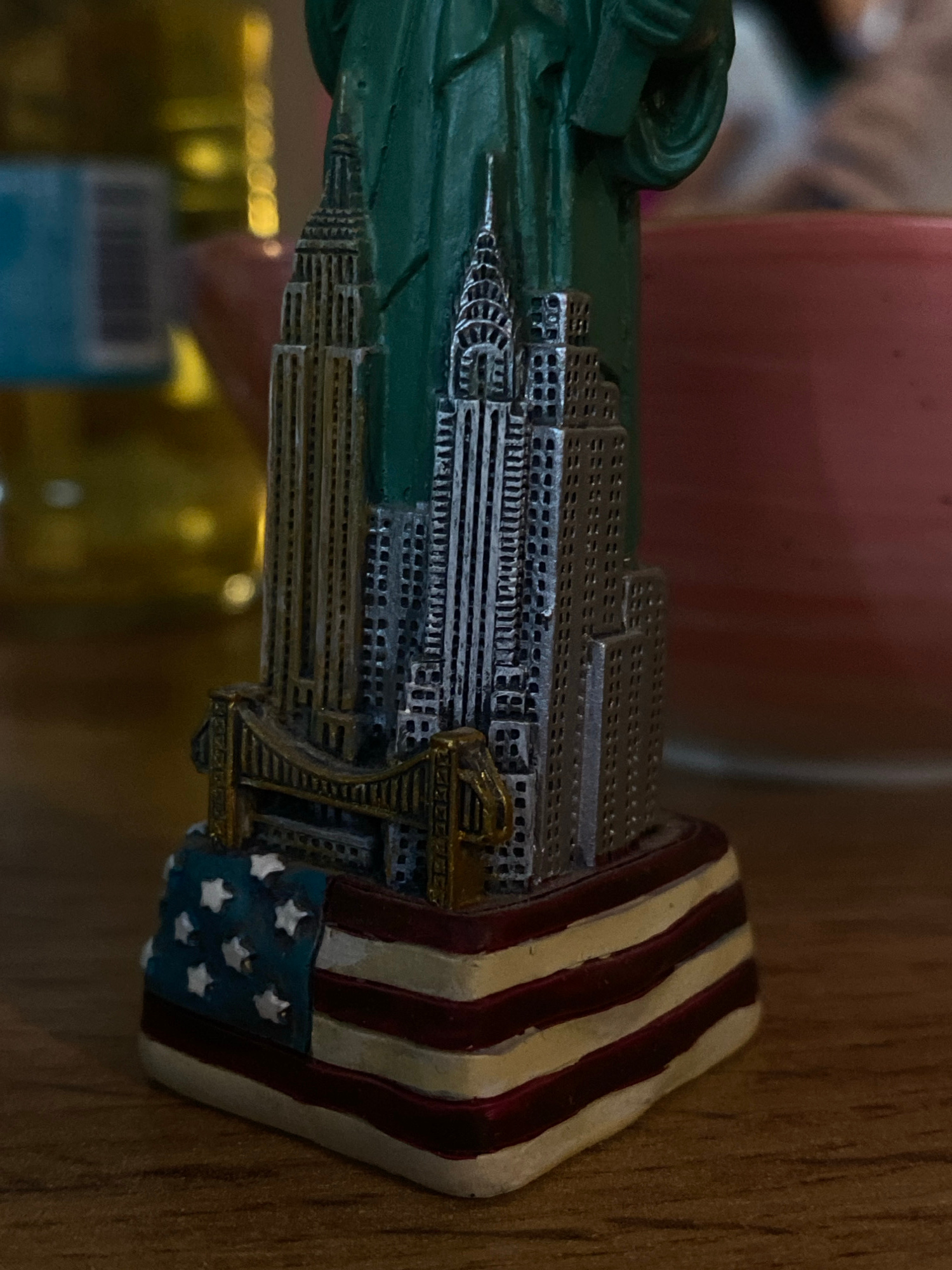 The image shows a souvenir depicting the Statue of Liberty, the New York City skyline, and the American flag. The souvenir is positioned horizontally against a wooden surface. The Statue of Liberty is…read more