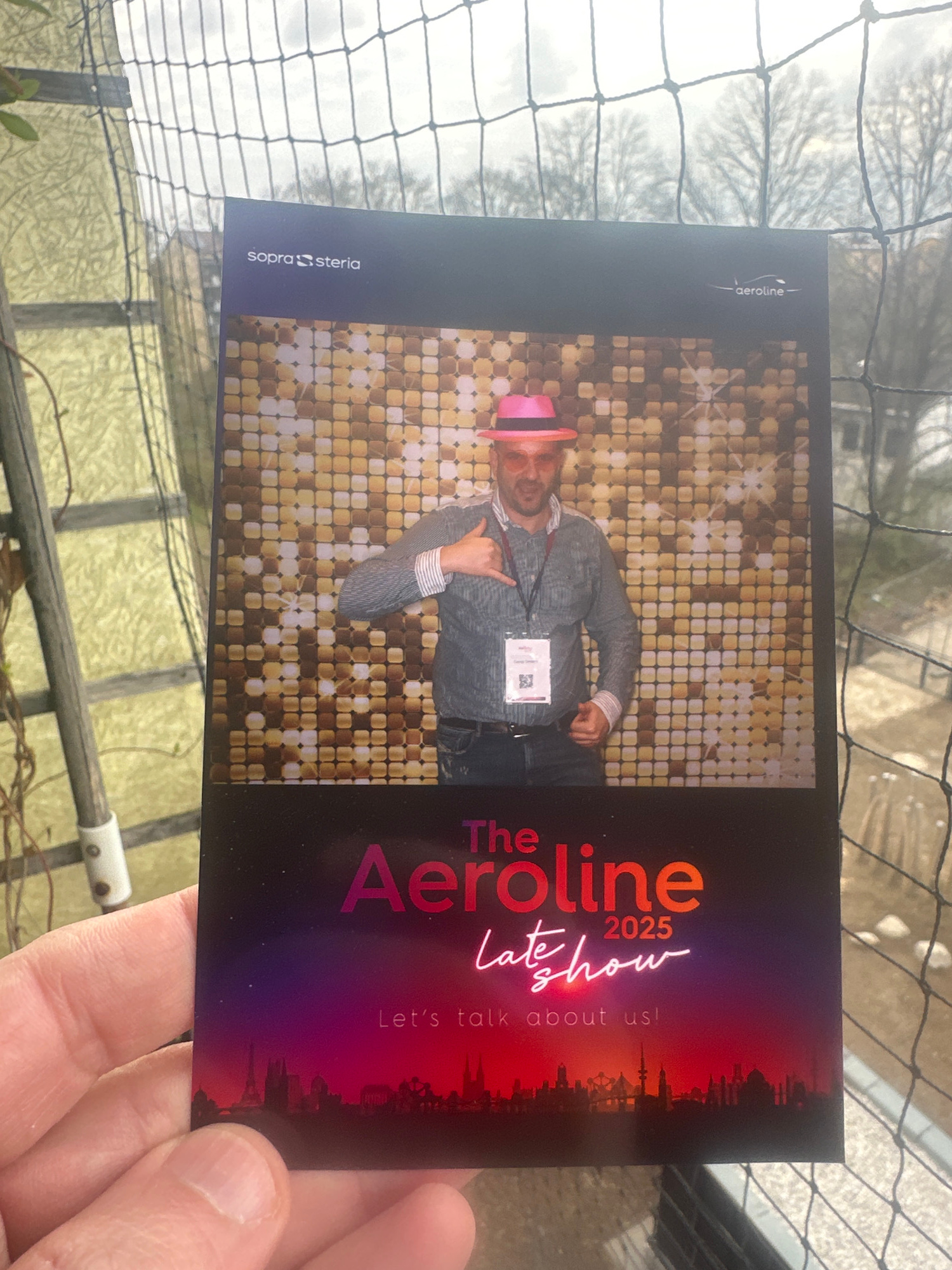 A close-up shot displays a rectangular card held by a human hand, likely outdoors near a garden or park. The card features a man wearing a pink hat and a badge, posing in front of a gold, square-patte…read more