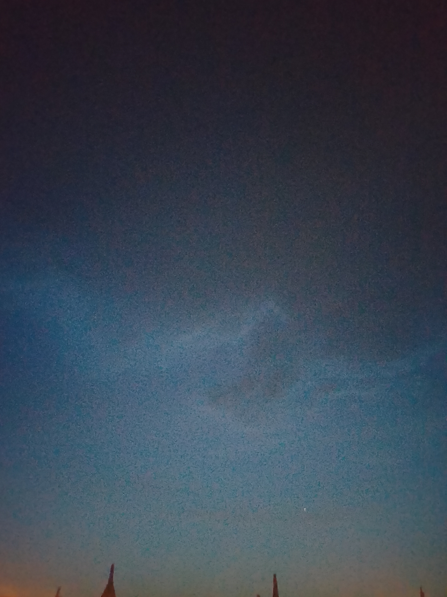 A dark, grainy image shows a night sky fading to orange on the horizon. Silhouettes of structures, potentially buildings, are visible at the bottom of the frame. A single, small light point is visible…read more