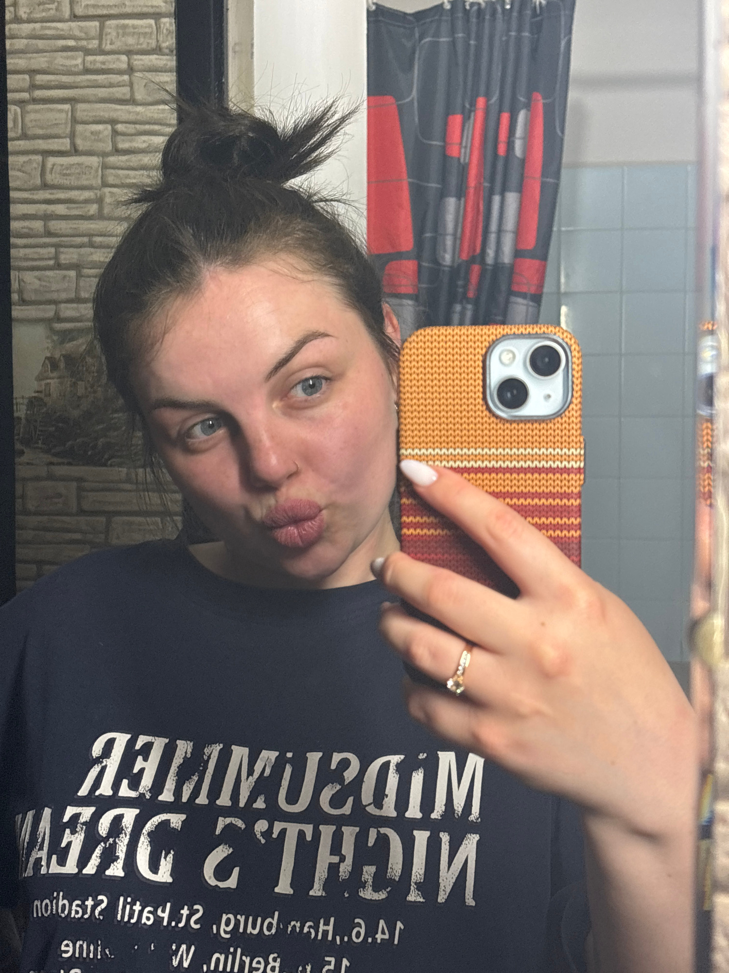 A woman is taking a selfie in a bathroom mirror, her hair in a messy bun. She is wearing a dark t-shirt with silver lettering. Her phone has a colorful knitted-style case. A ring is visible on her fin…read more