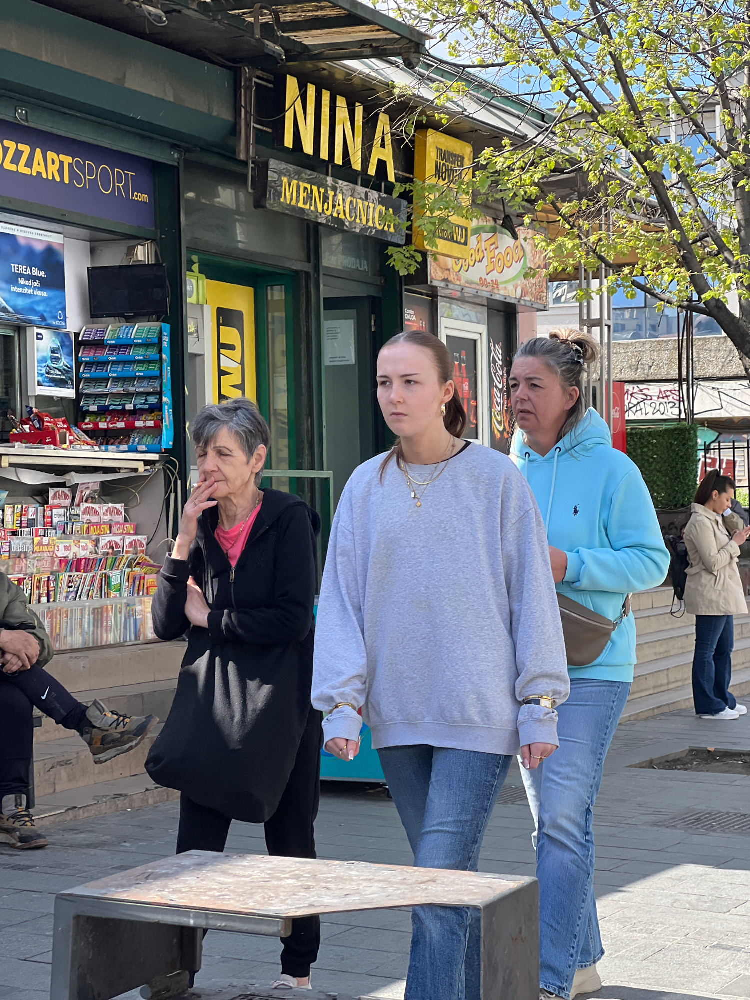 The image captures a street scene in Belgrade, Serbia. In the foreground, three women stand on the sidewalk. One wears a light blue hoodie and jeans, another is in a light gray sweatshirt and jeans, a…read more
