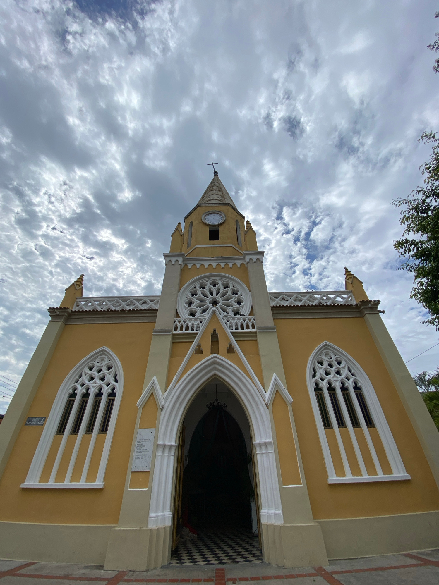 The image shows the front exterior of a church in San José de Barlovento, Venezuela. The church is painted in yellow with white trim around its windows and arches. The entrance is framed by a large ar…read more