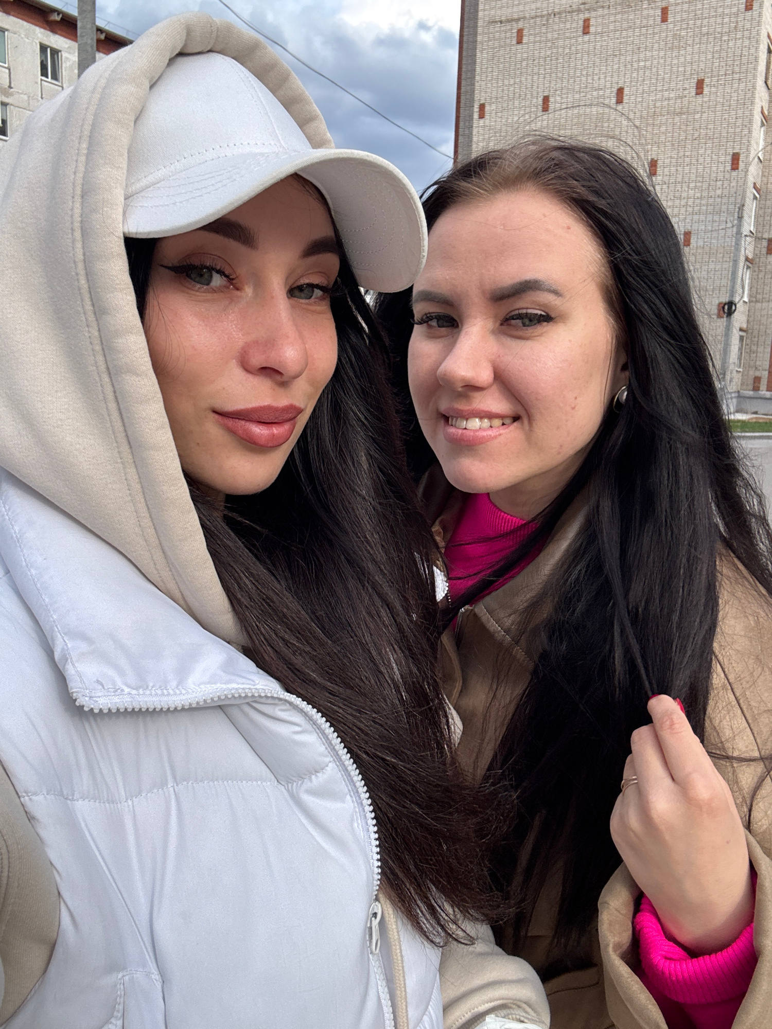 This close-up outdoor photo, set in Chaikovsky, Russia, features two young women posing together on what appears to be an overcast day. The woman positioned in the upper right part of the frame has l…read more