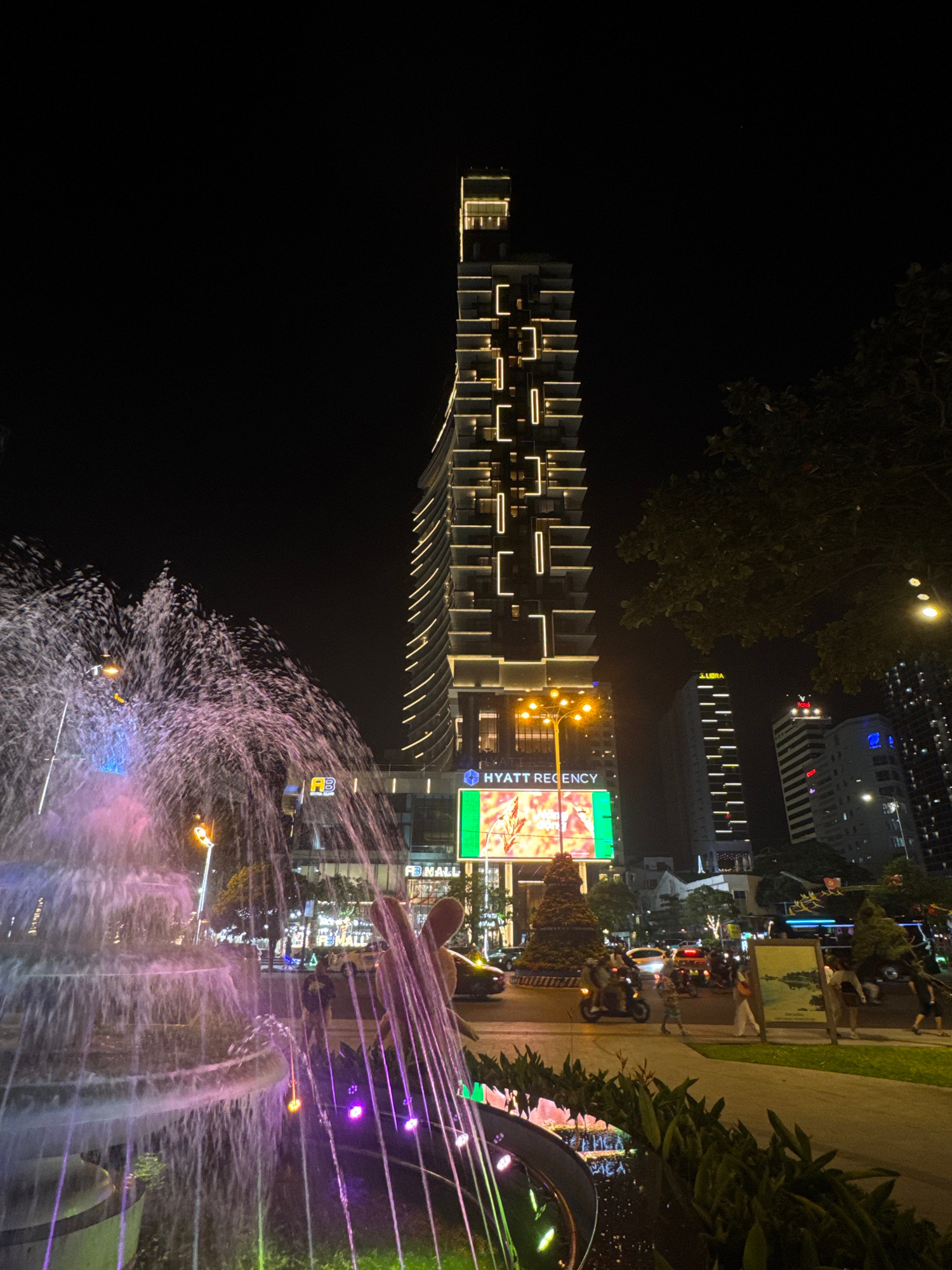 At night, a fountain with pink and purple lighting sprays water upwards in the foreground. Behind the fountain, streetlights illuminate a sidewalk with people, motorbikes, and artwork. The Hyatt Regen…read more