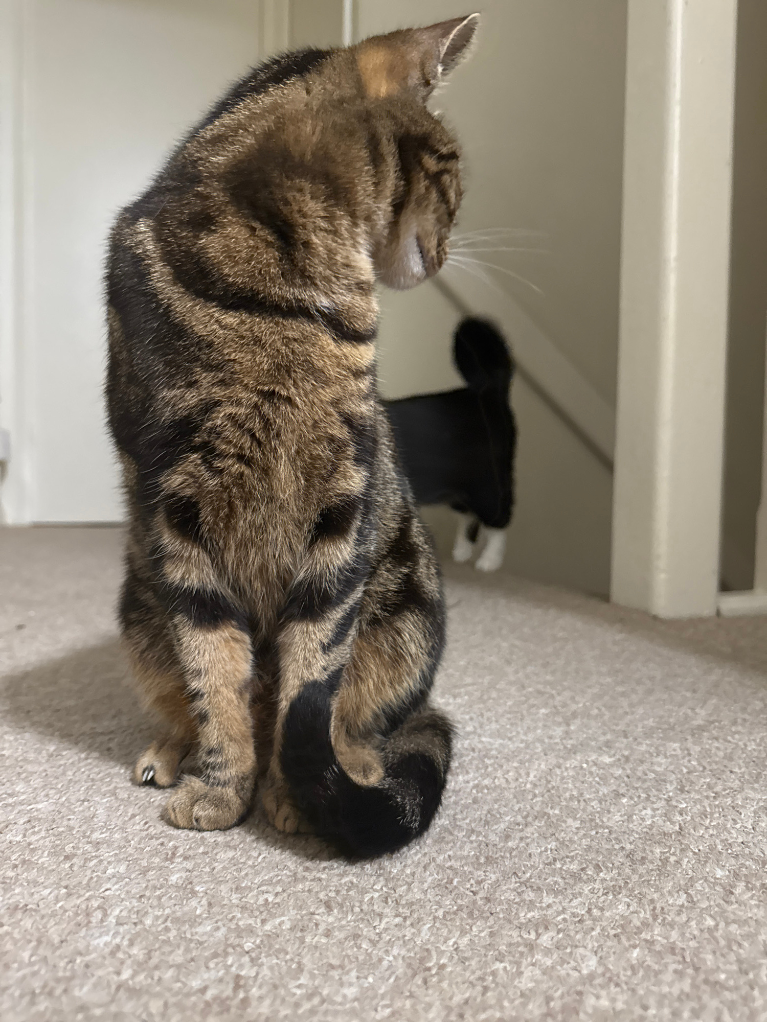 A brown tabby cat is curled up on a beige carpet, appearing to be resting or sleeping. The cat's head is oriented toward the left side of the image, with its tail curled around its body on the right.…read more