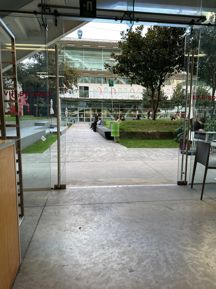 Through glass doors, a concrete walkway leads to a green space. People are sitting on benches. A large, modern building with glass walls stands in the background, partly obscured by trees. Reflections…read more