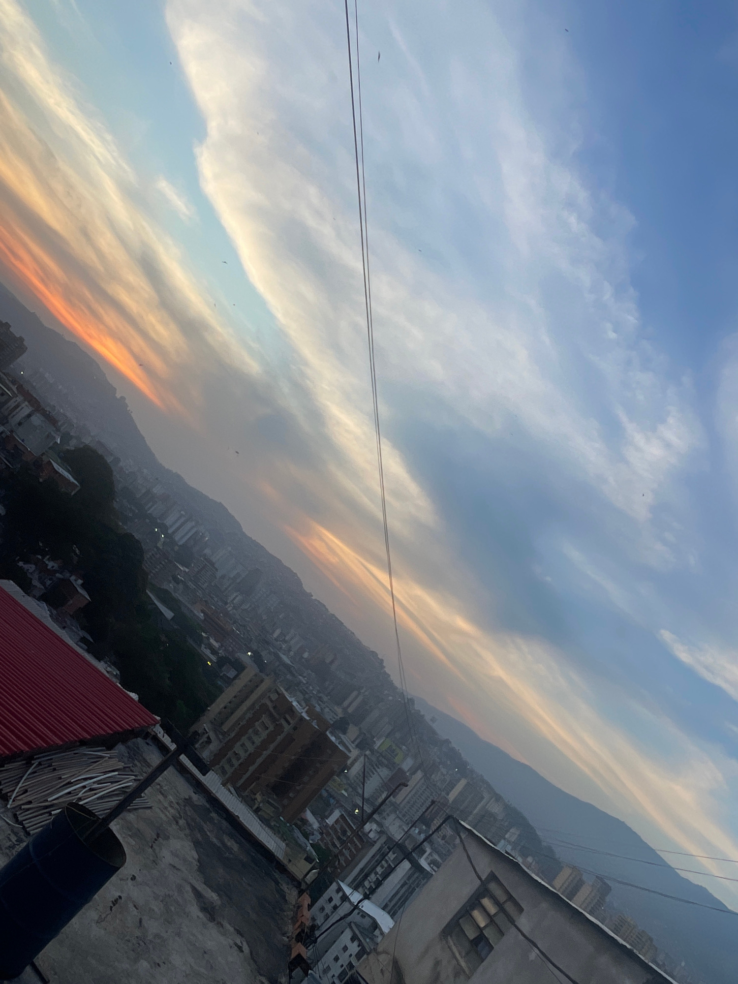 The image shows a cityscape at dusk, likely Caracas, Venezuela, based on the buildings, terrain, and context. The view is from a high vantage point, possibly a rooftop. The sky has a combination of bl…read more