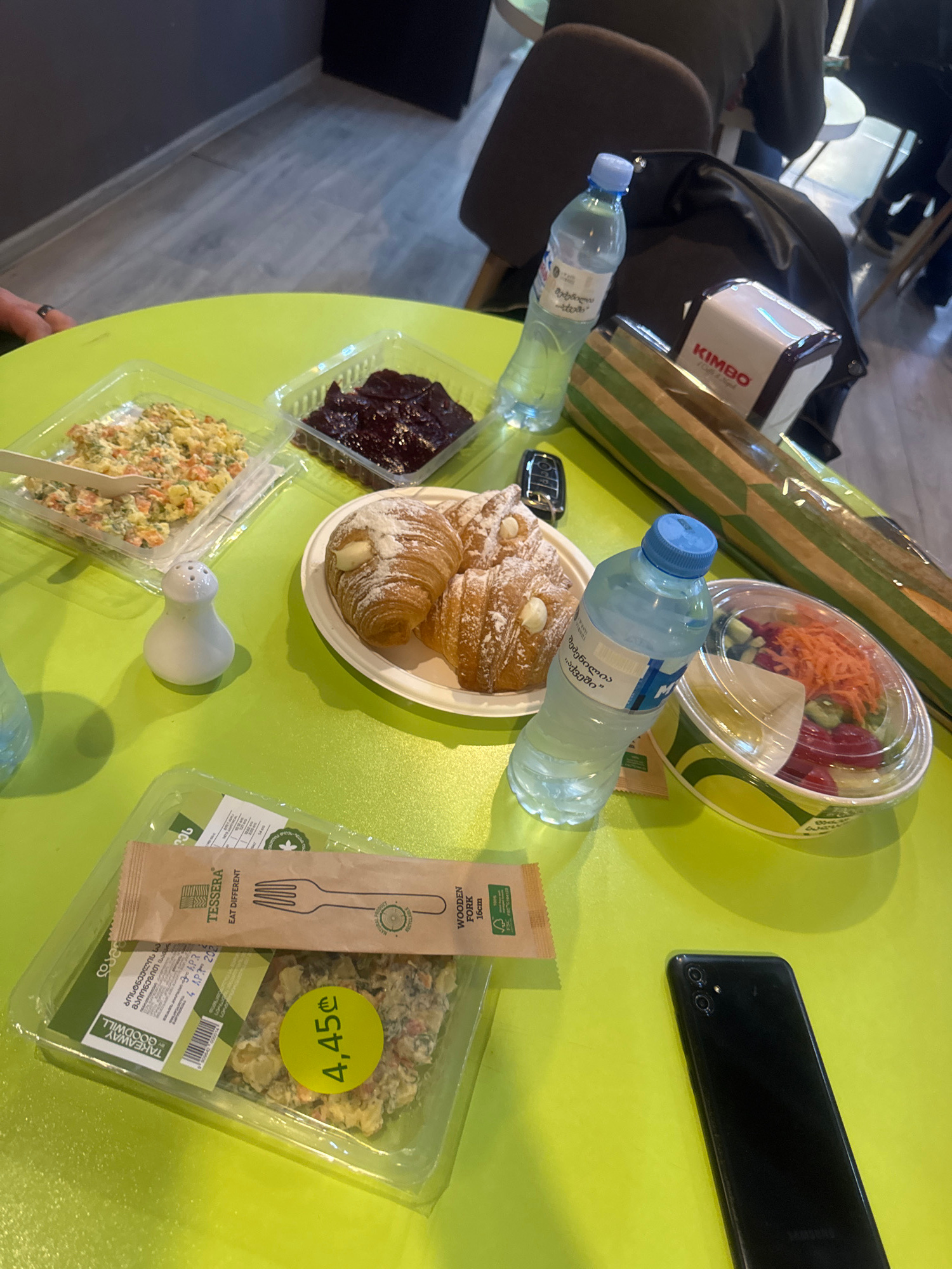 On a light green surface, likely a tabletop, there are several food items. A clear plastic container holds a salad with carrots and red vegetables. Nearby is a bottle of water with a blue cap. A white…read more