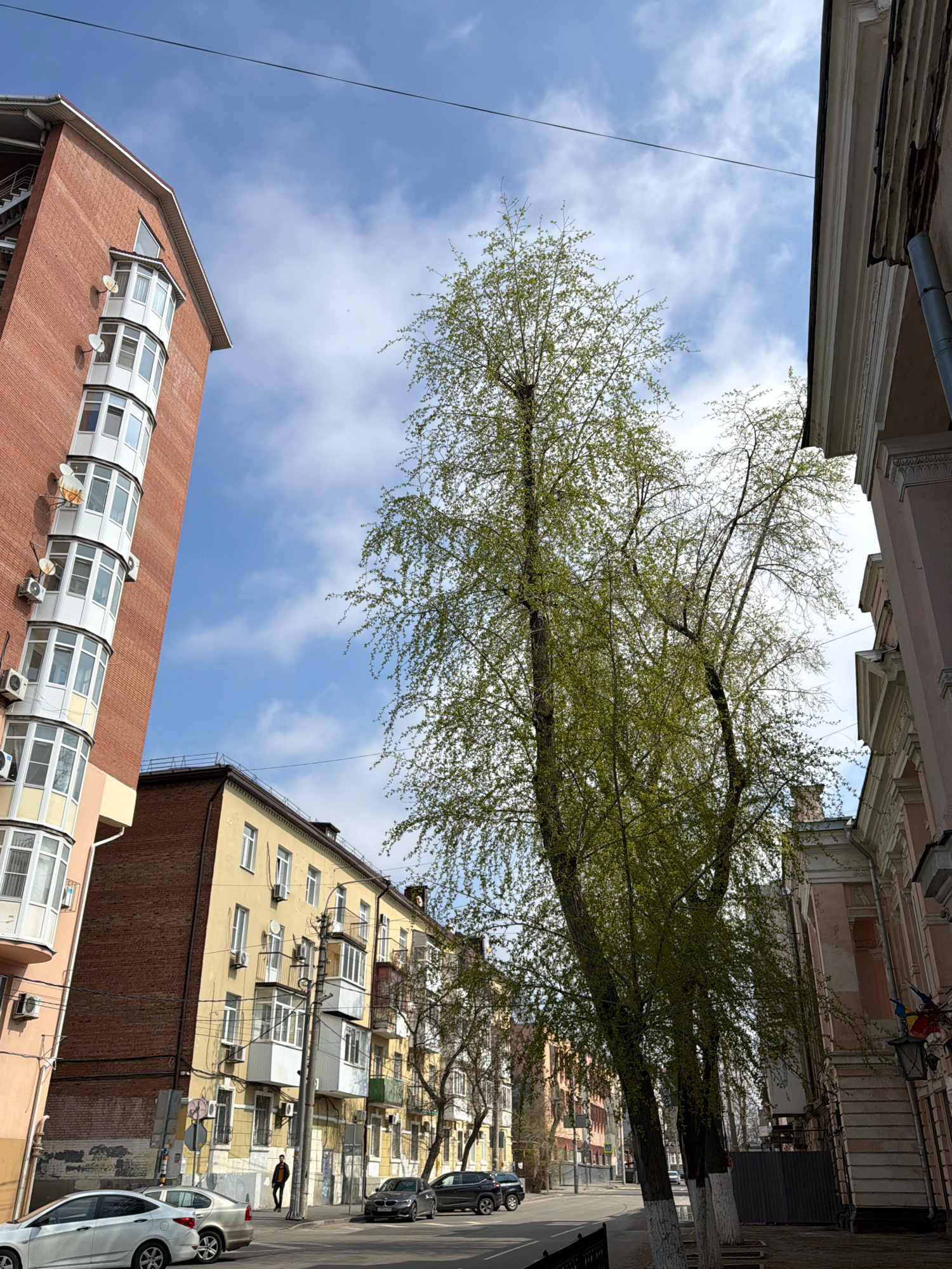 The image depicts a street scene in Rostov-on-Don, Russia, viewed from a low angle looking up between buildings. On the left is a reddish-brick building topped with a white glassed-in atrium. Air cond…read more