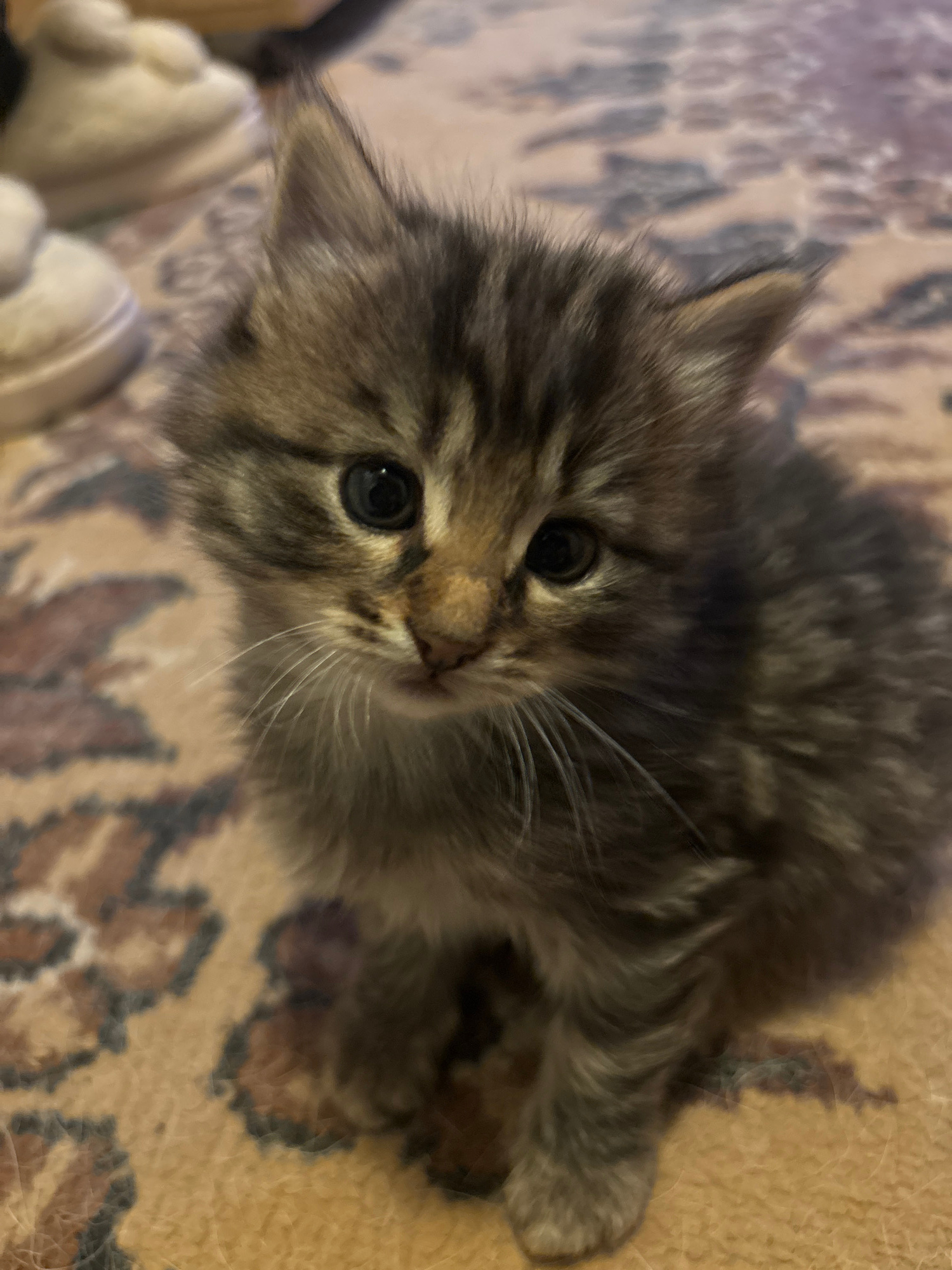 A kitten with brown and gray tabby fur is looking up at the camera. It has black eyes and long white whiskers. The kitten is sitting on a tan carpet with a floral pattern in browns and blacks. The loc…read more