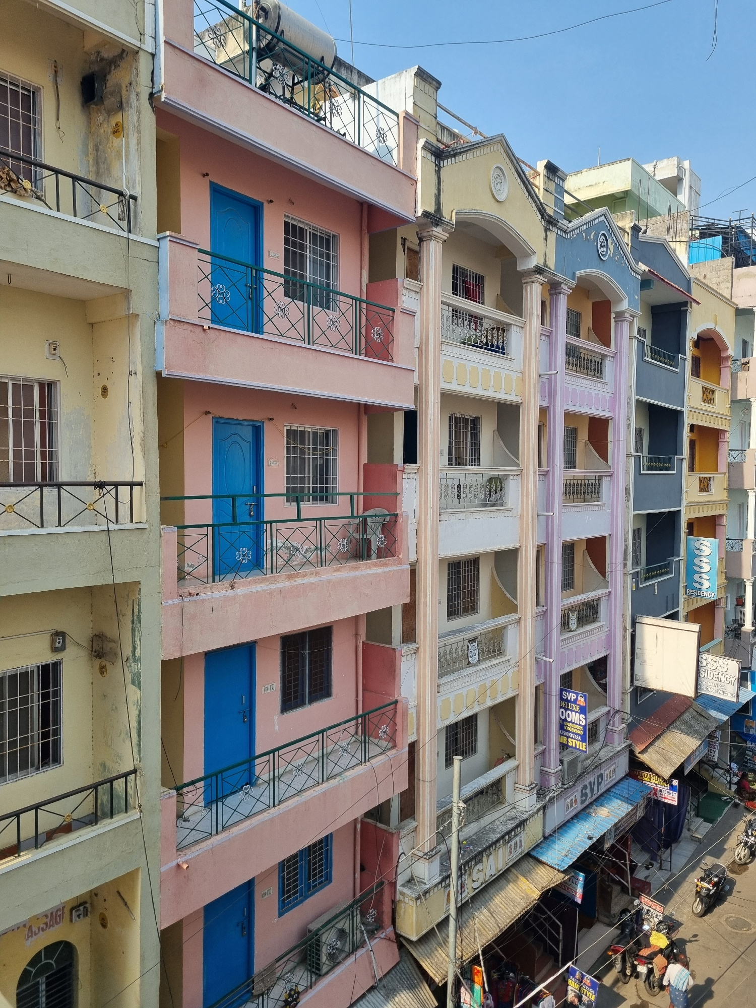 The image depicts a vertically-oriented view of a multi-story building in Puttaparthi, India. The building's facade features a mix of colors, including pink, blue, yellow, grey, and other hues. The ar…read more