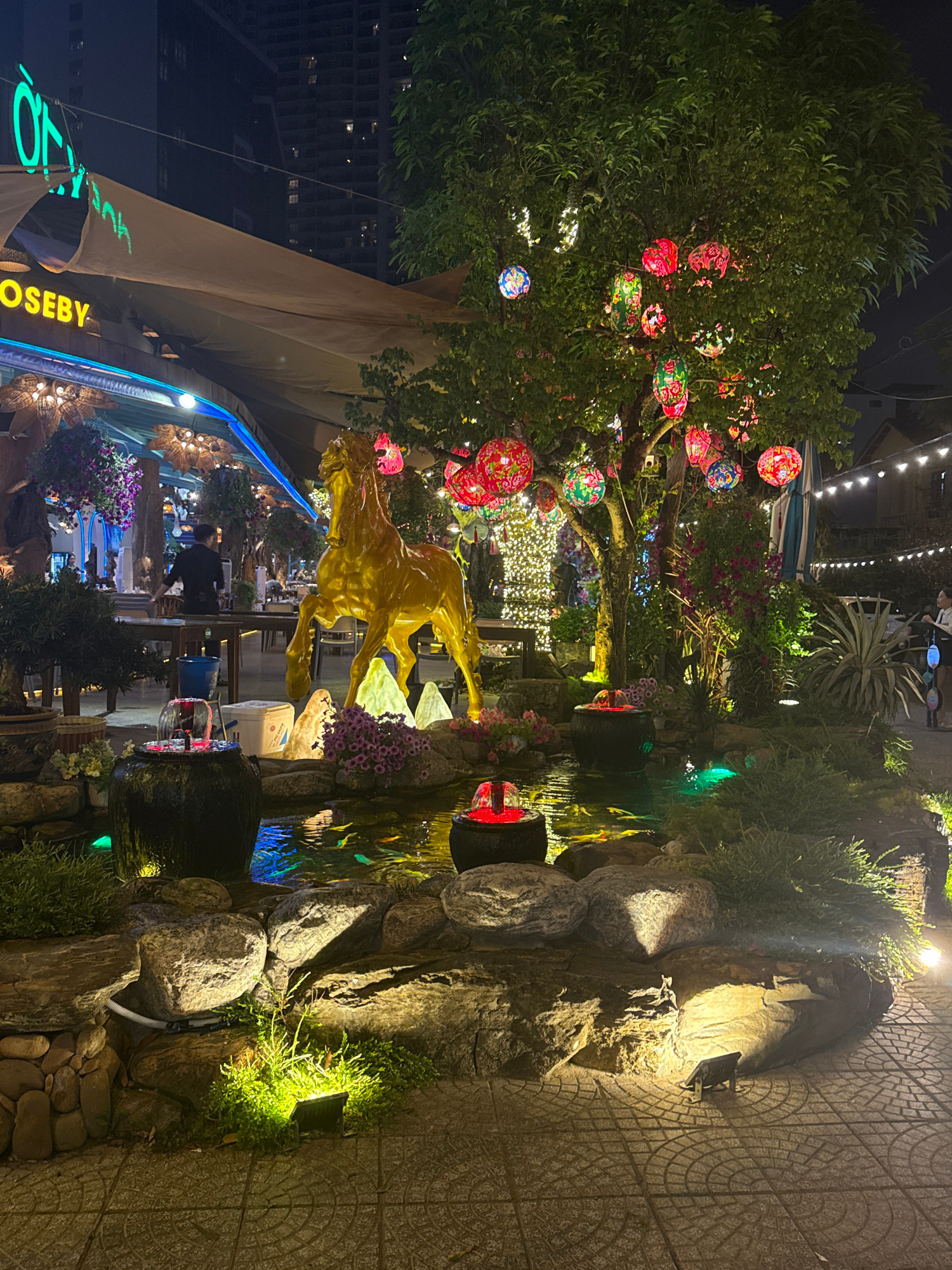 This nighttime image captures an elaborately decorated outdoor space, likely a restaurant or garden in Da Nang, Vietnam, illuminated by numerous artificial lights. At the center of the scene is a str…read more