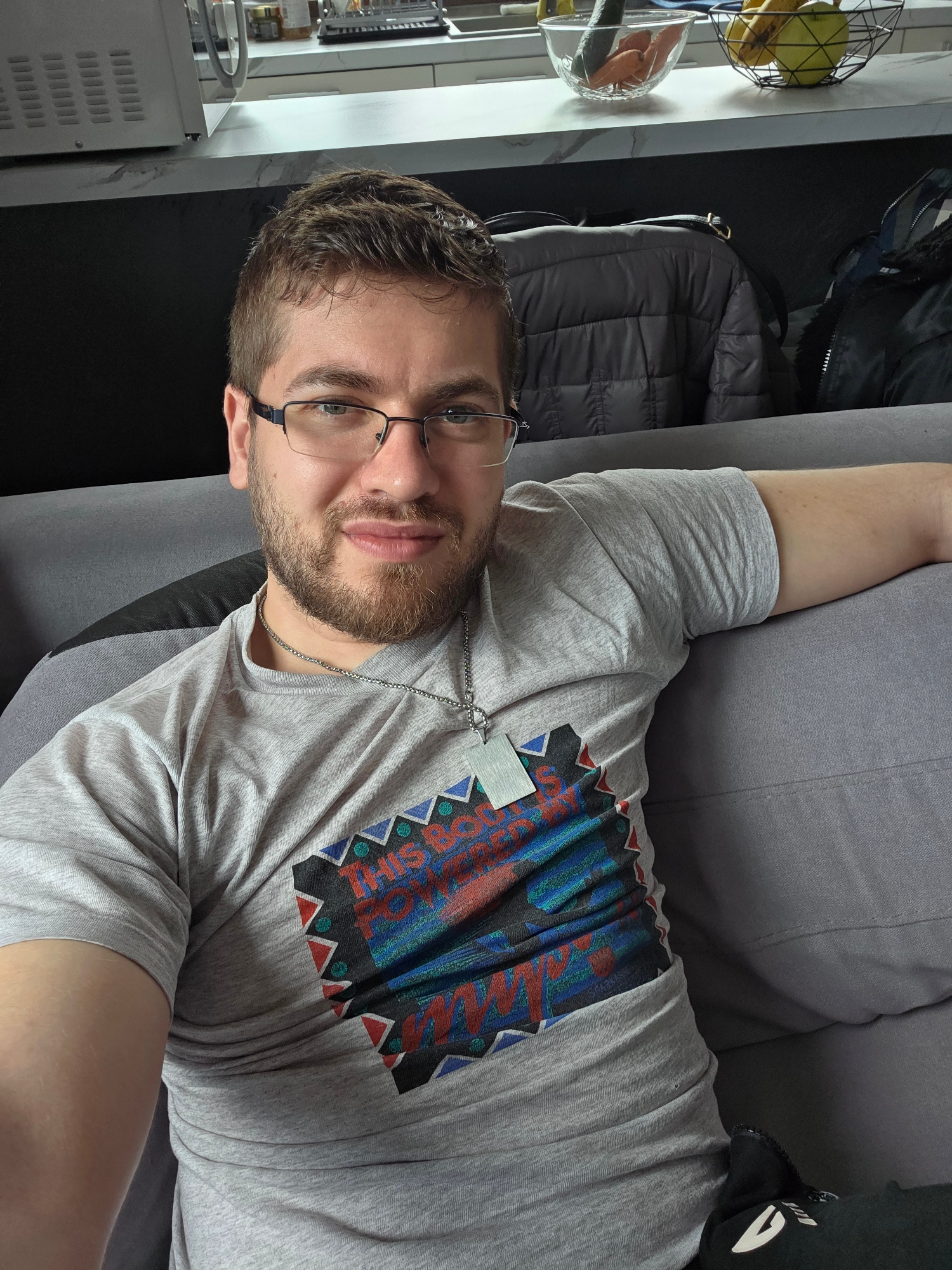 A man is lying on a gray sofa. He is wearing a gray T-shirt with a colorful geometric design on the front and a silver chain necklace. He has short brown hair, a beard, and glasses. Behind him is a bl…read more