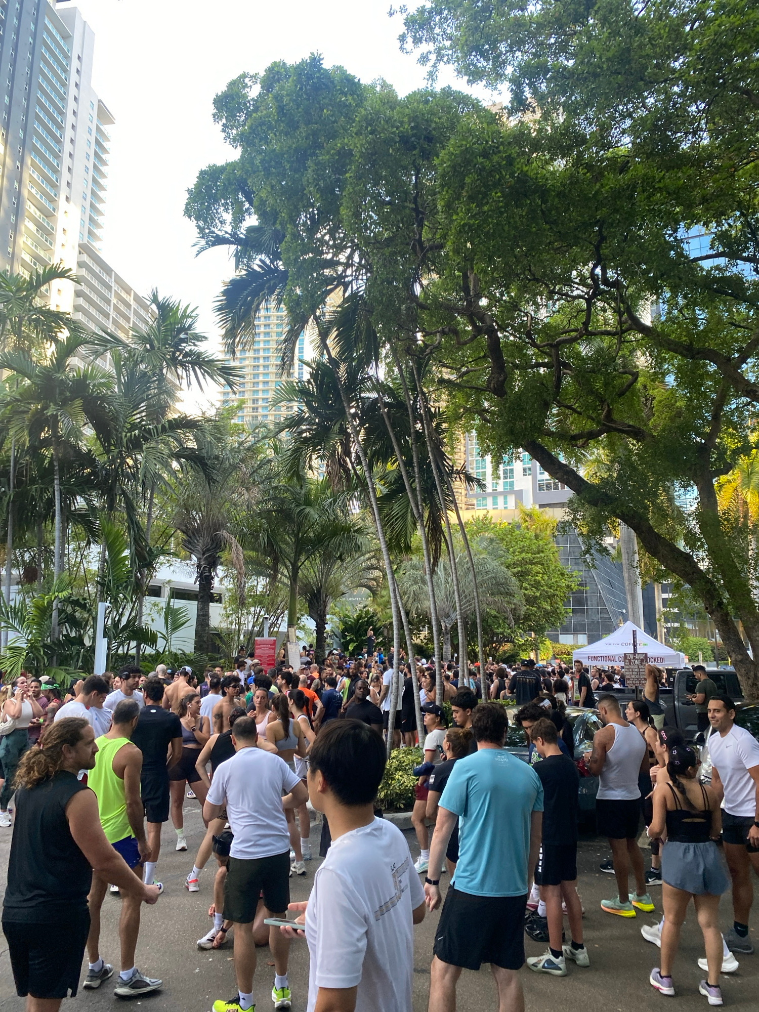 A large group of people are densely gathered outdoors in Miami, Florida. The majority are wearing athletic clothing, with many in shorts and t-shirts. The people appear to be exercising, stretching, o…read more