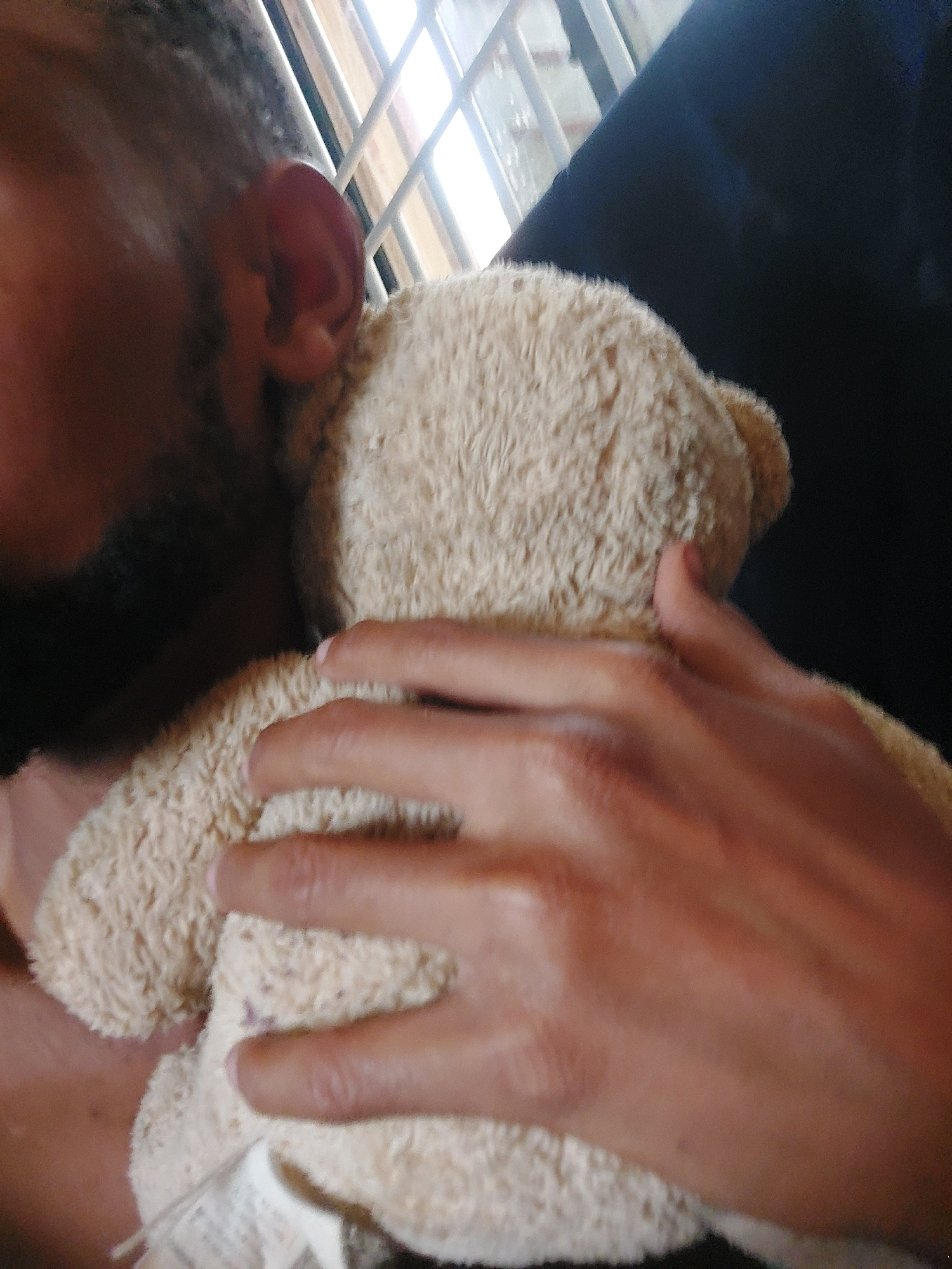 A person is holding a tan teddy bear to their face. The person has dark hair and a beard. Their ear is visible. The person's hand is on the teddy bear. Tags are visible on the bear. The background is…read more