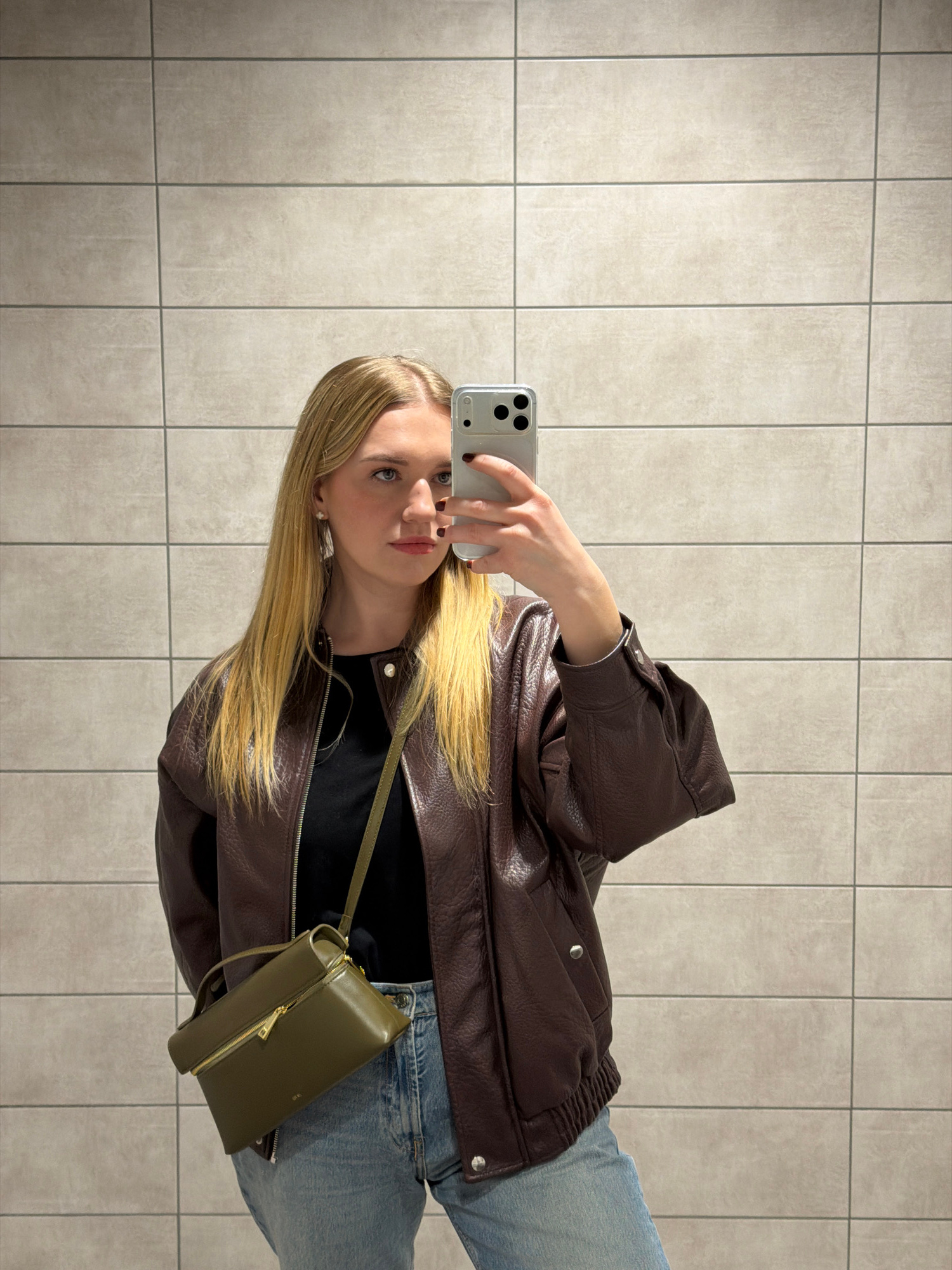 A woman with blonde hair is taking a selfie with a smartphone in front of a wall with beige square tiles. She's wearing a brown leather jacket, a black top, and light blue jeans. A small olive-green p…read more