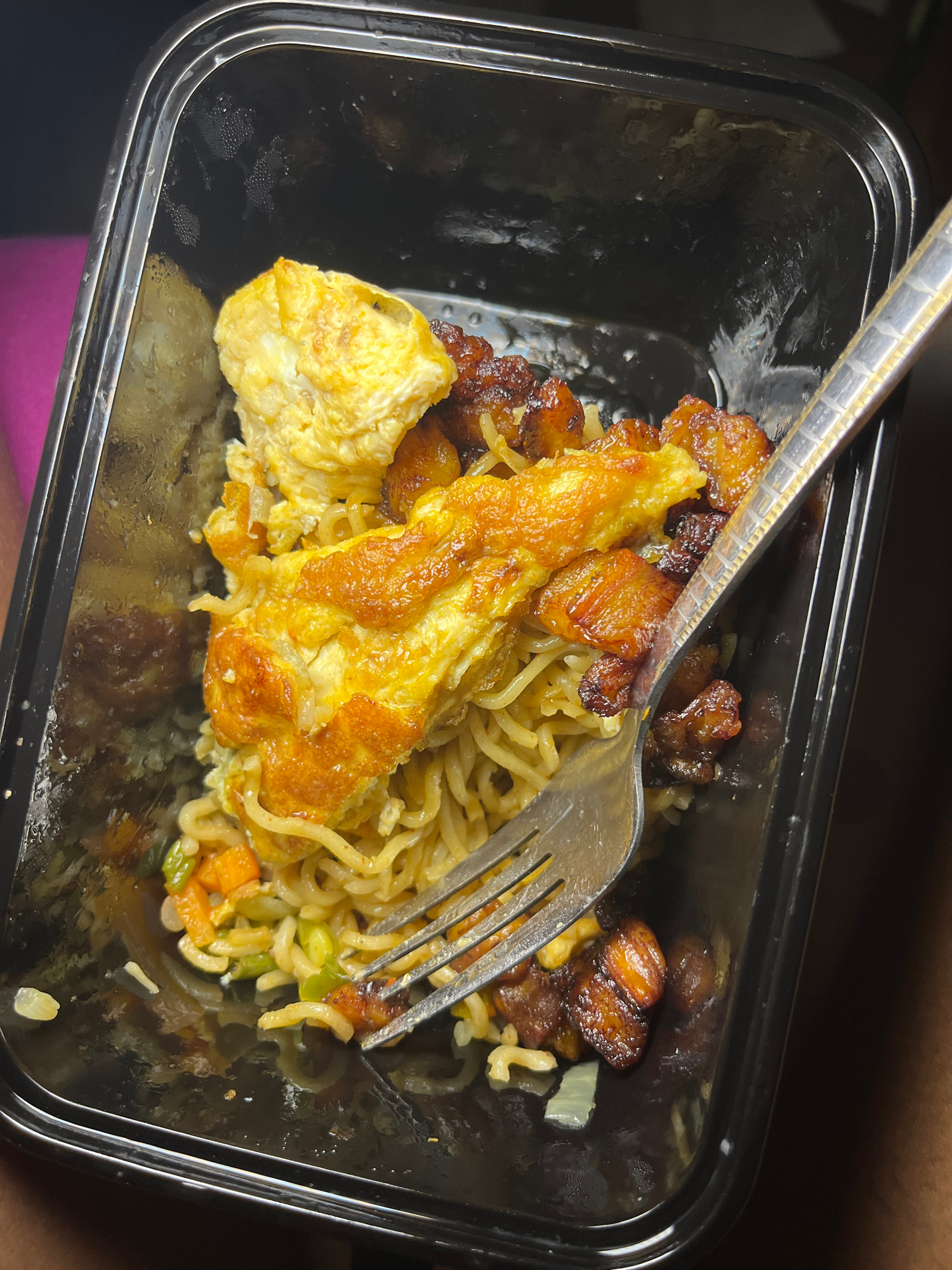 The image shows a black plastic container holding a meal of noodles, fried eggs, and cubed pieces of meat. A metal fork is stuck in the food. The specific location in Ado, Nigeria, and information abo…read more