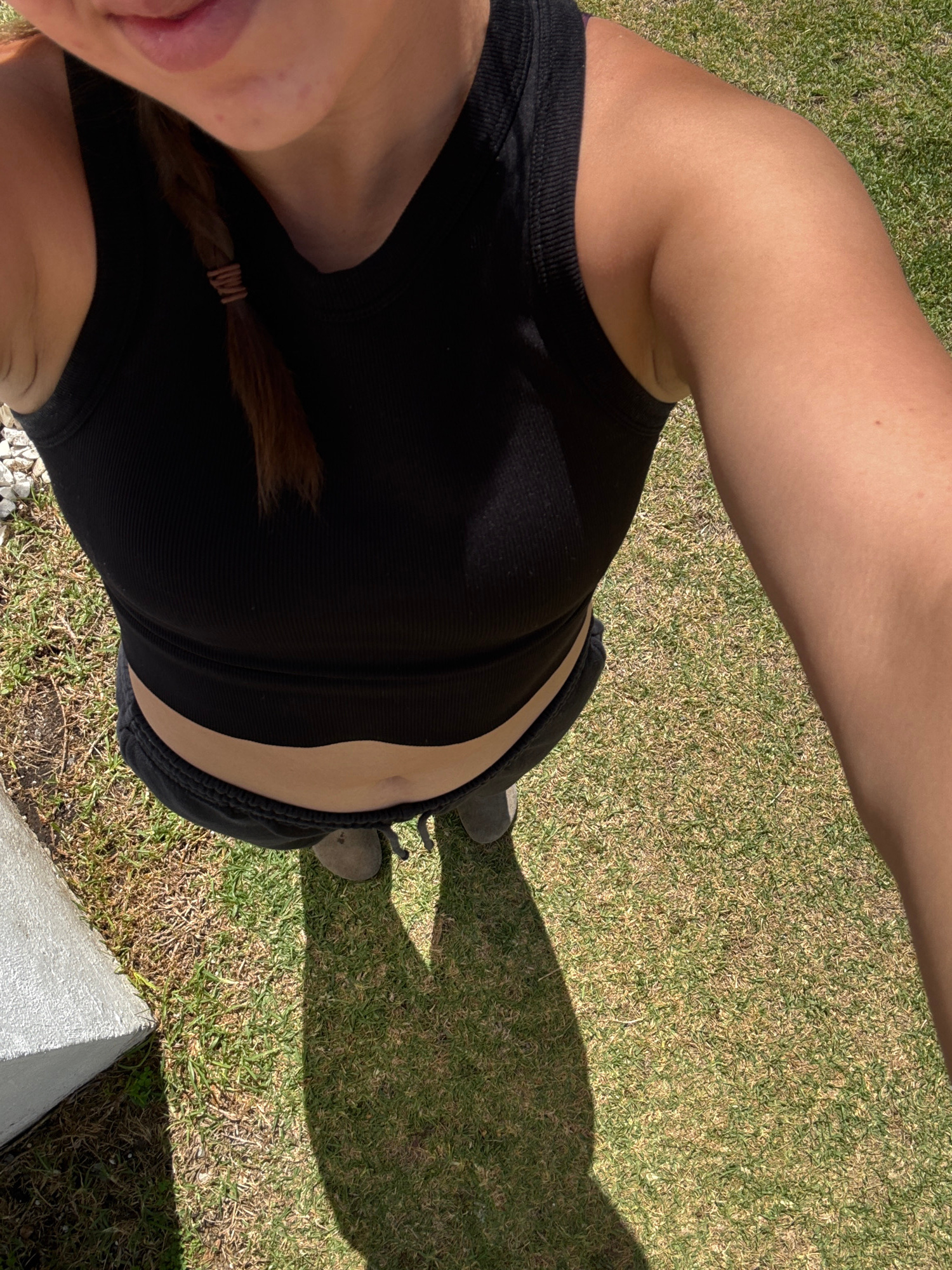 A first-person, downward-angled perspective shows a person standing on a grassy area. The person is wearing a black tank top and dark shorts. Part of the person's face is visible on the left side of t…read more