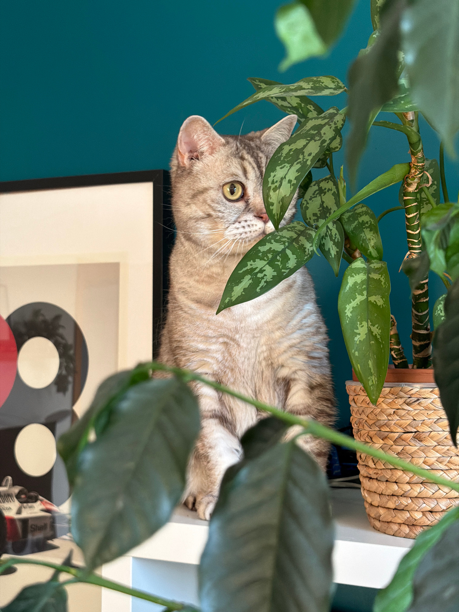 A medium shot depicts a tan tabby cat peering out from behind and among leaves of various green houseplants. The cat is lying on a shelf, partially obscured by foliage. Behind the cat is a woven baske…read more