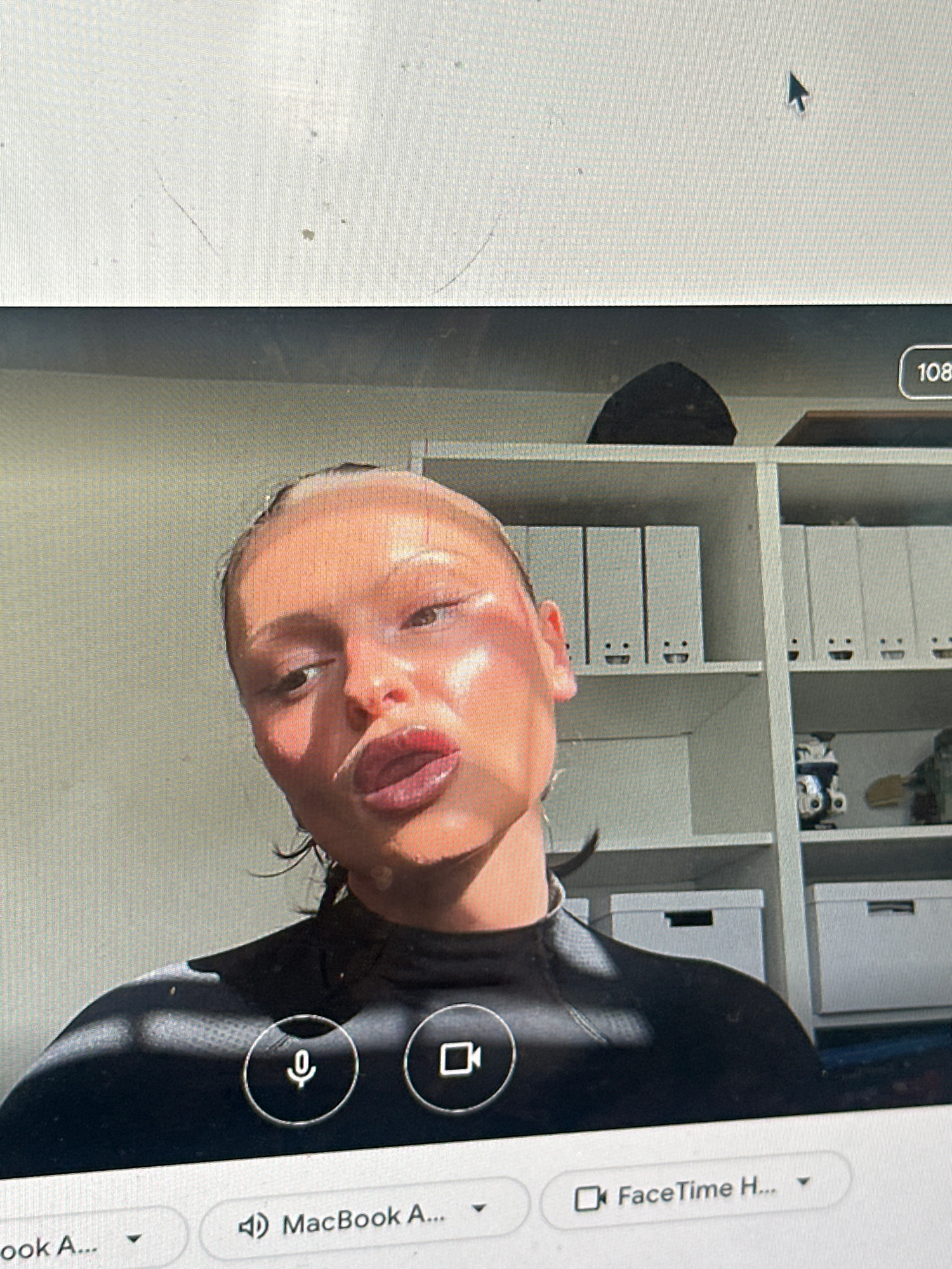 The image displays a computer screen exhibiting a video call, purportedly from a location in Wealden, United Kingdom. The screen itself shows minor surface imperfections, including visible dust specks…read more