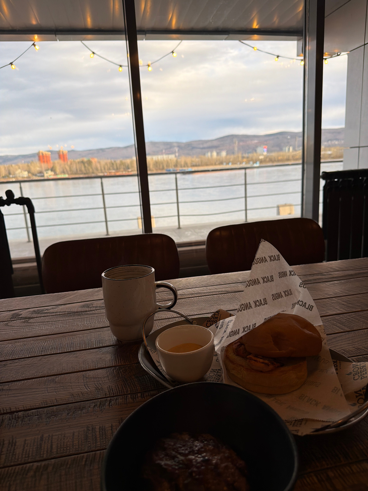 Here is a detailed description of the image: **Overall Scene:** The image is taken indoors, likely in a restaurant or cafe, at a table next to a large window. The table is made of dark wood planks.…read more