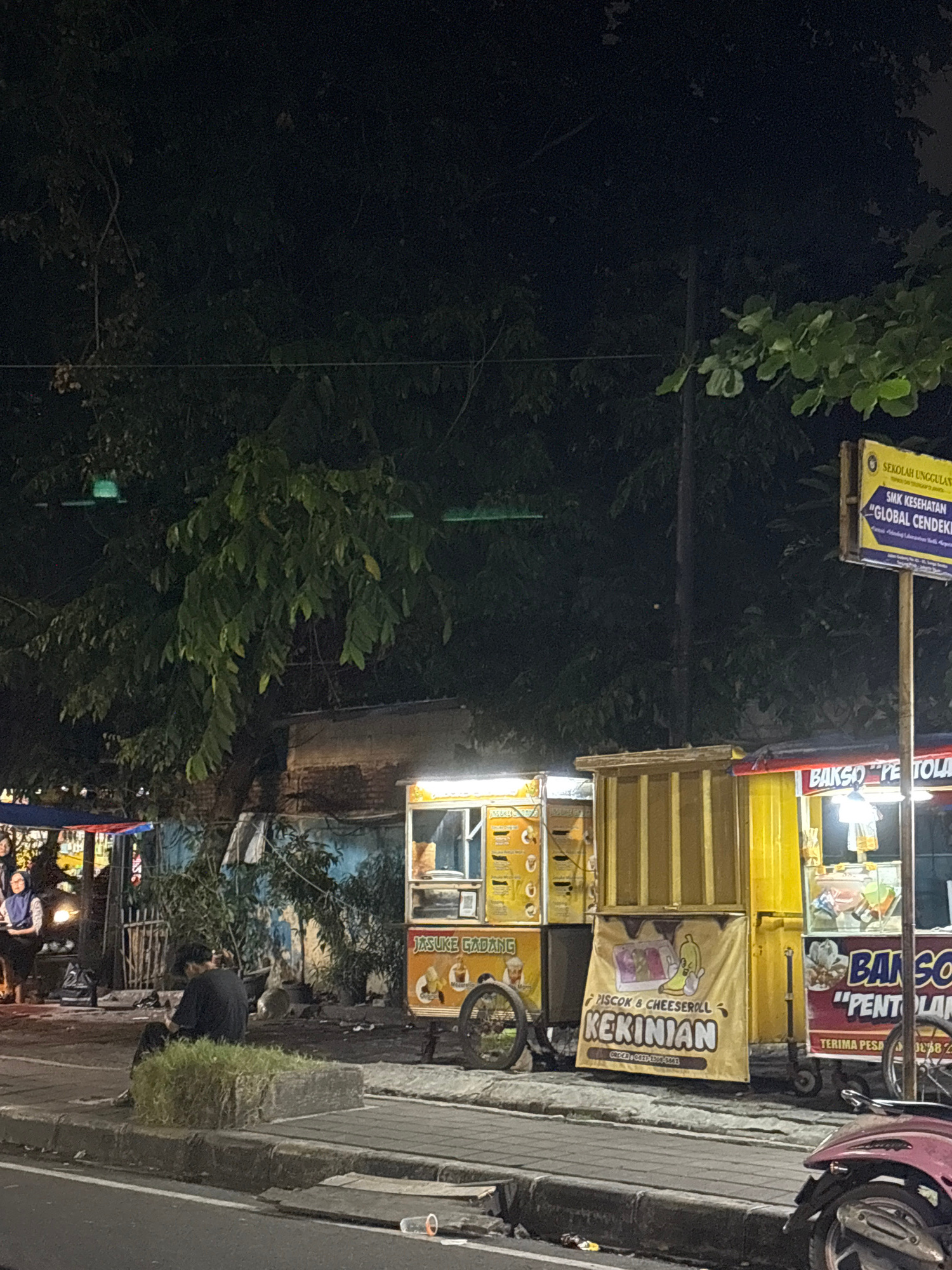 At night in North Jakarta, Indonesia, a row of street food vendors line the edge of the pavement. Each vendor has a cart with signage, including a yellow cart advertising "JASUKE GADANG," a cart withβ¦read more