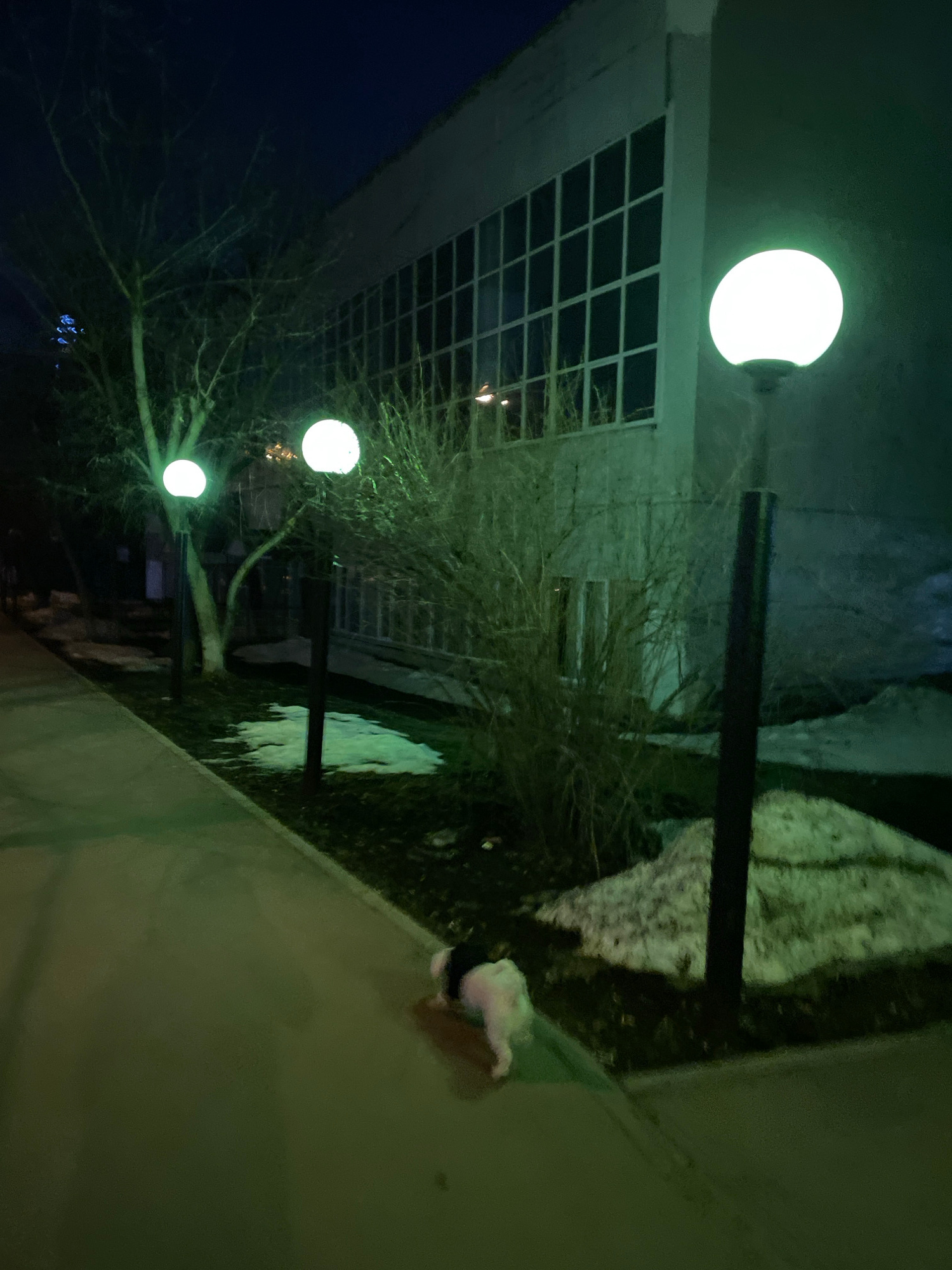 The image shows a street scene at night, likely in Yekaterinburg, Russia. Three spherical streetlights illuminate a building with grid-patterned windows and surrounding foliage. Patches of snow are vi…read more