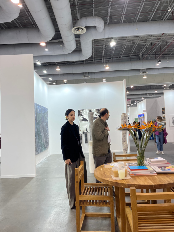 Inside an art exhibit hall, a woman in a black coat and gray pants stands near a white wall, looking at art. Nearby, a man in a green jacket also views artwork on a white wall. Above, industrial pipin…read more