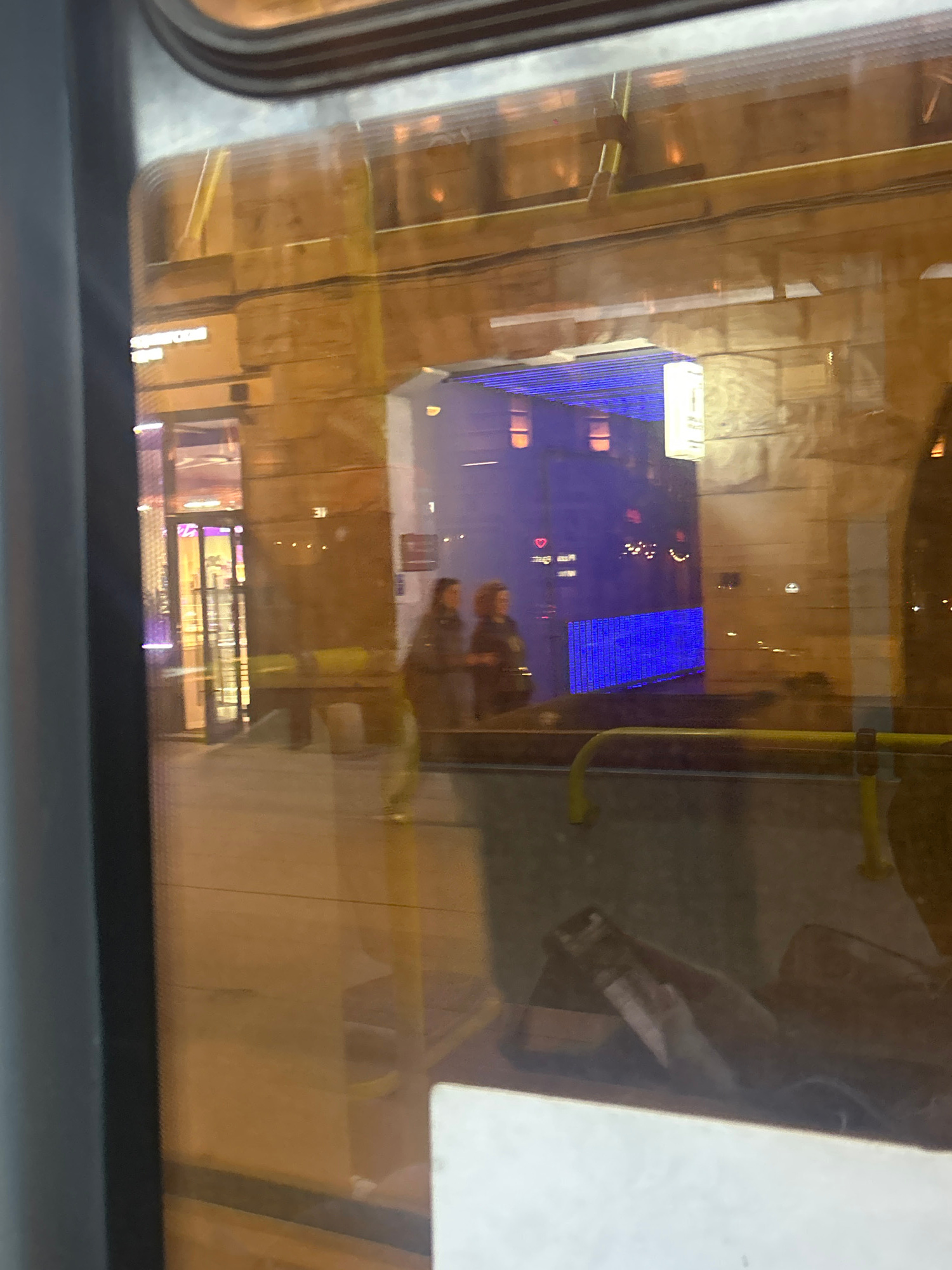 The media file presents a nighttime scene viewed through a window, likely from a vehicle such as a bus or tram, characterized by prominent reflections. The window glass has a warm, brownish tint, crea…read more