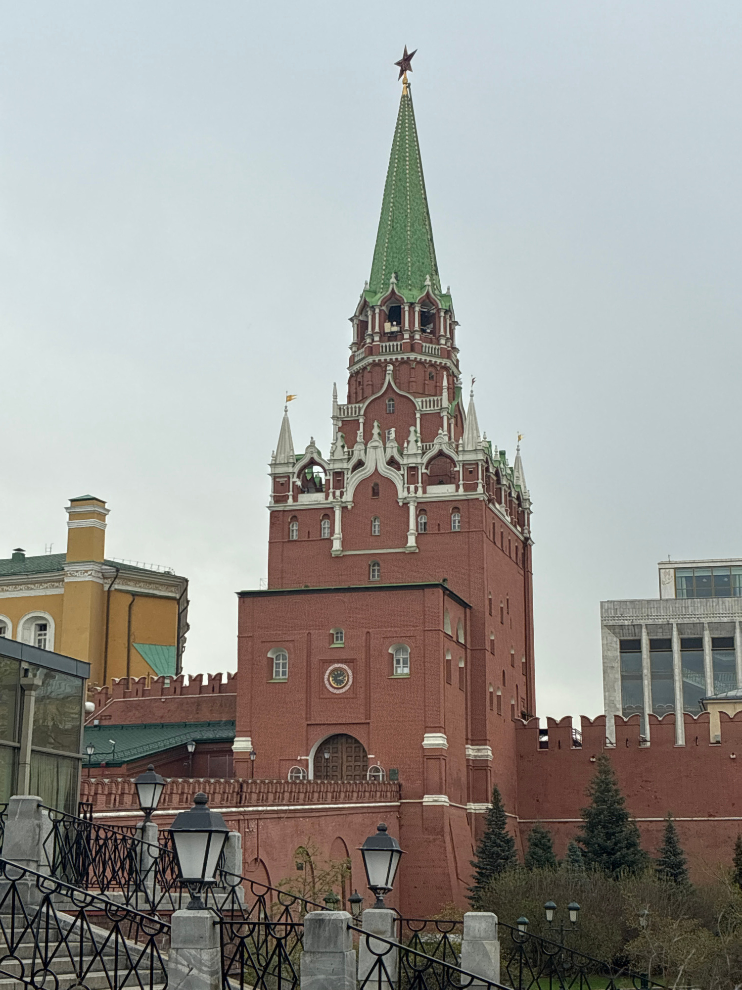 The image captures a prominent, historic red brick tower, characteristic of the Moscow Kremlin, under an overcast, light grey sky. The tower features intricate white architectural detailing around its…read more