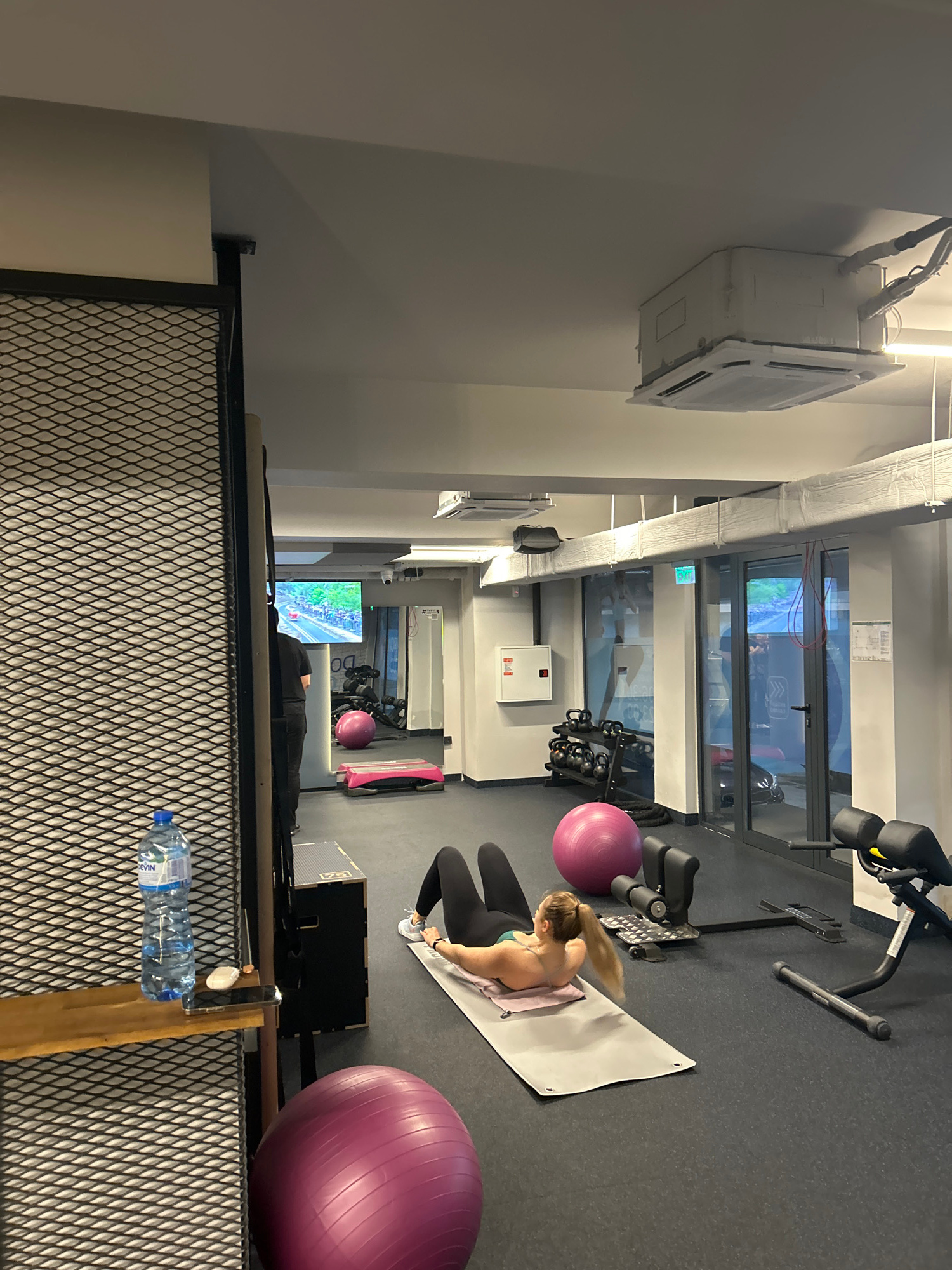 A high-angle shot inside a gym in Varna, Bulgaria. A woman with blonde hair in a ponytail is lying on a grey mat. She is wearing a green top and black leggings. There are two pink exercise balls, one…read more