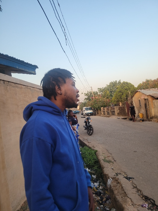 A man with dreadlocks, wearing a blue hoodie, gazes upwards. Overhead, power lines stretch across a bright, clear sky. Adjacent to the man is a building, and a street scene unfolds in the background.…read more