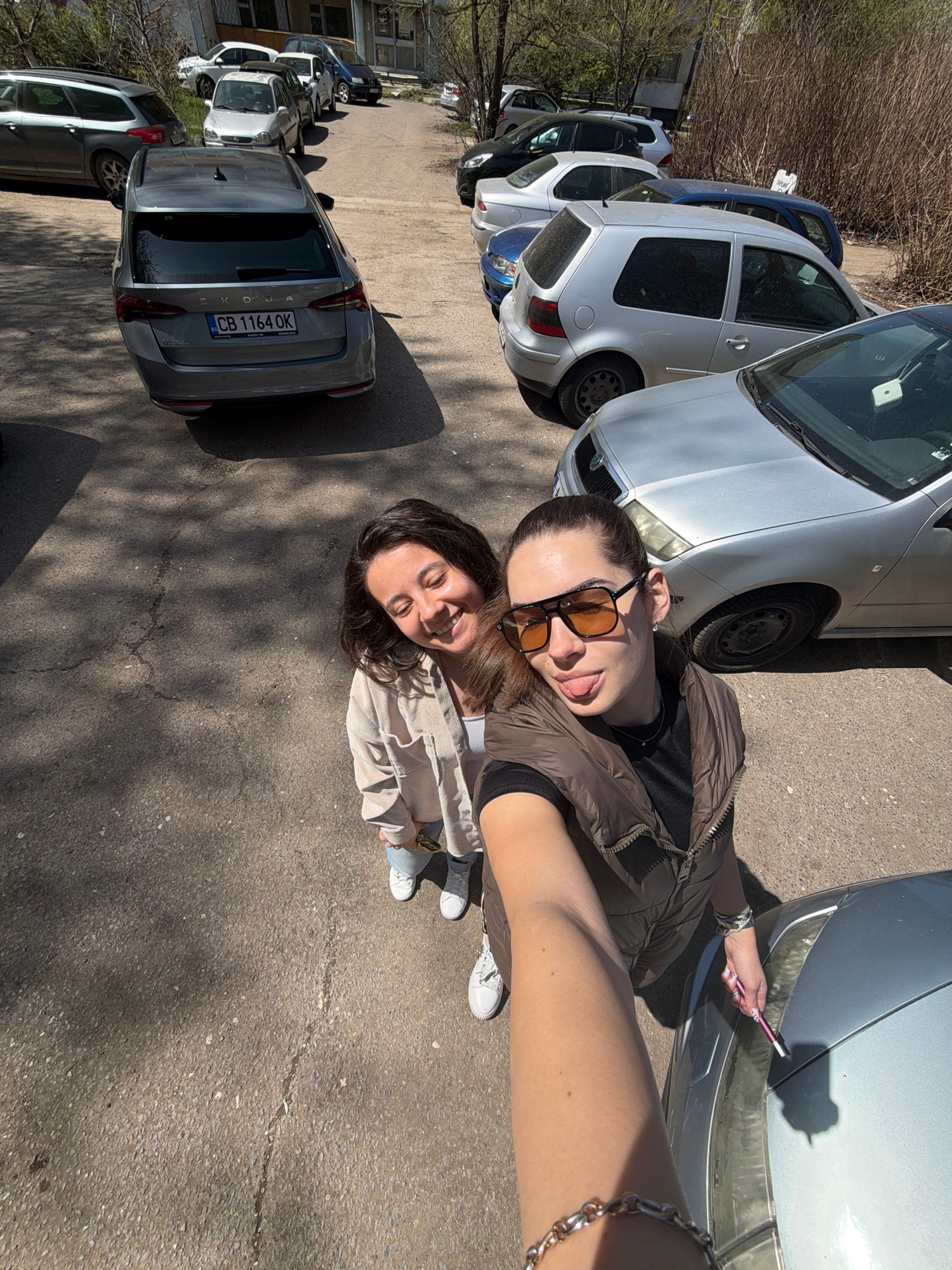 The image captures a rotated outdoor selfie of two women in Sofia, Bulgaria. The woman in the foreground, taking the picture, wears a brown puffer vest over a dark top, dark-rimmed sunglasses with amb…read more