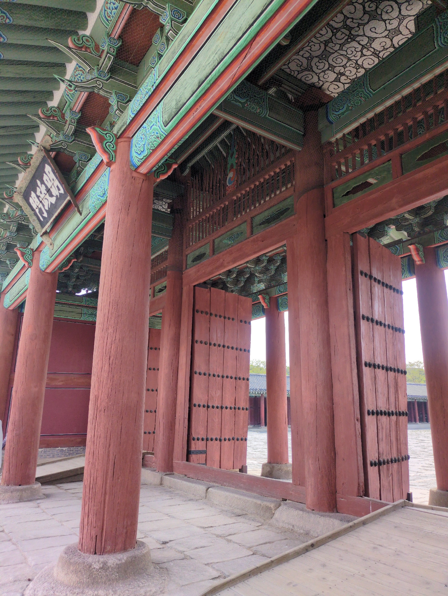 The image depicts the architecture of a traditional Korean building, likely in Seoul, South Korea. Visible are painted wooden columns, beams, and eaves, typical of Korean historical architecture. The…read more