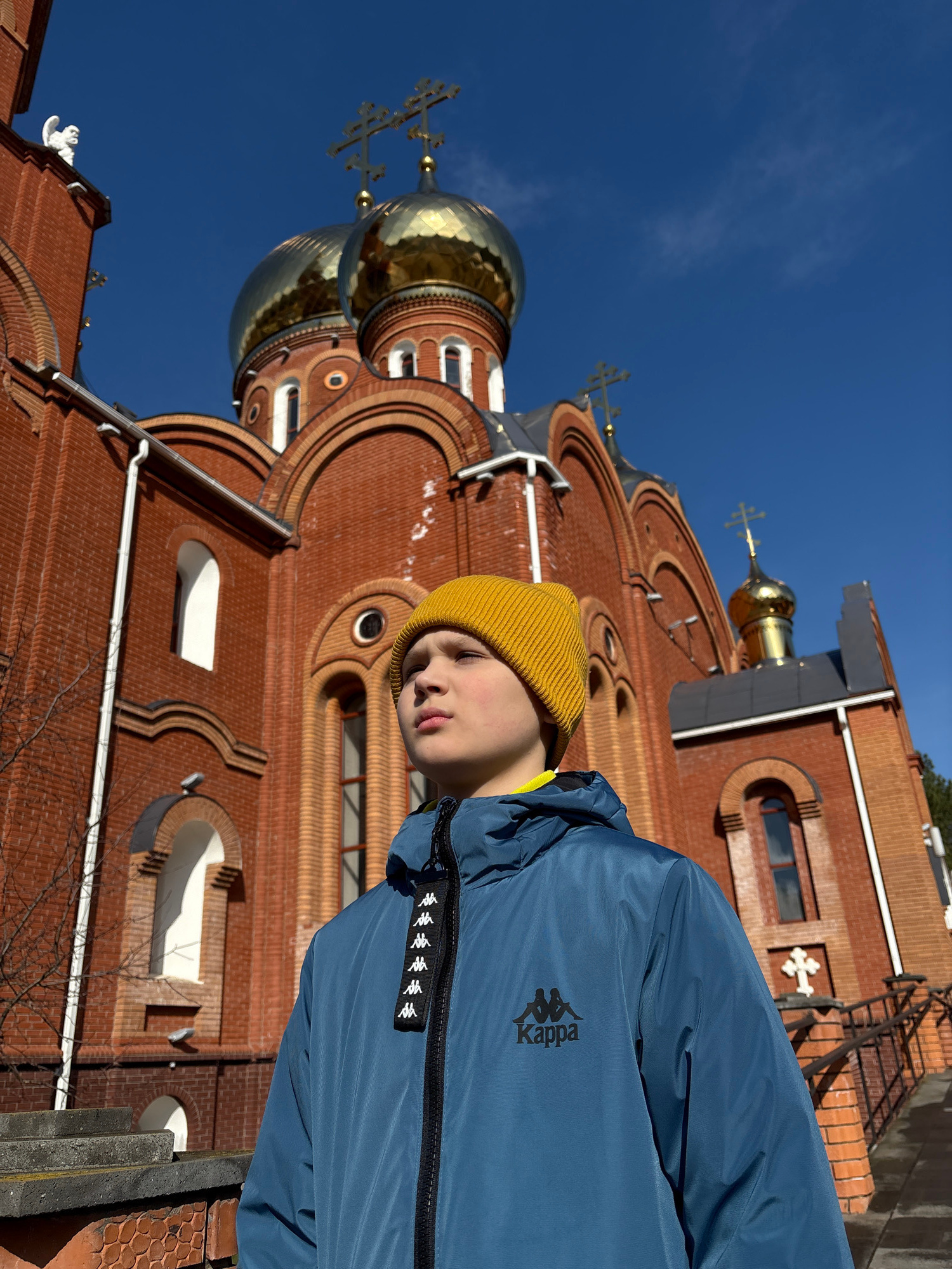 A medium shot shows a person wearing a yellow beanie and blue Kappa brand jacket, juxtaposed against the red brick and gold domes of a Russian Orthodox church under a clear blue sky. The building's ar…read more