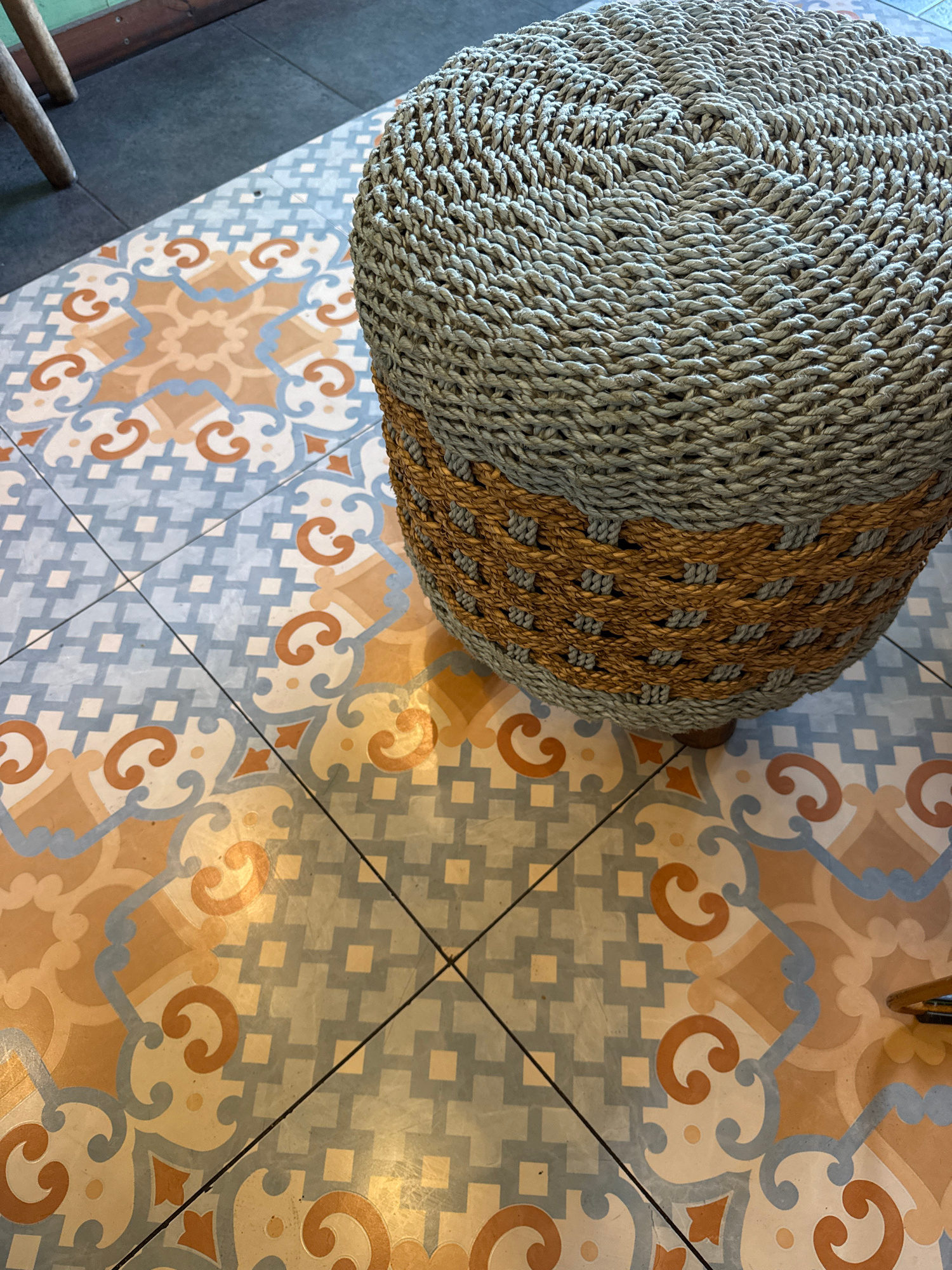 The image captures an overhead view of a woven pouf on a patterned tiled floor within an interior setting. The main subject is a large, round pouf, likely made from natural fibers such as seagrass orβ¦read more