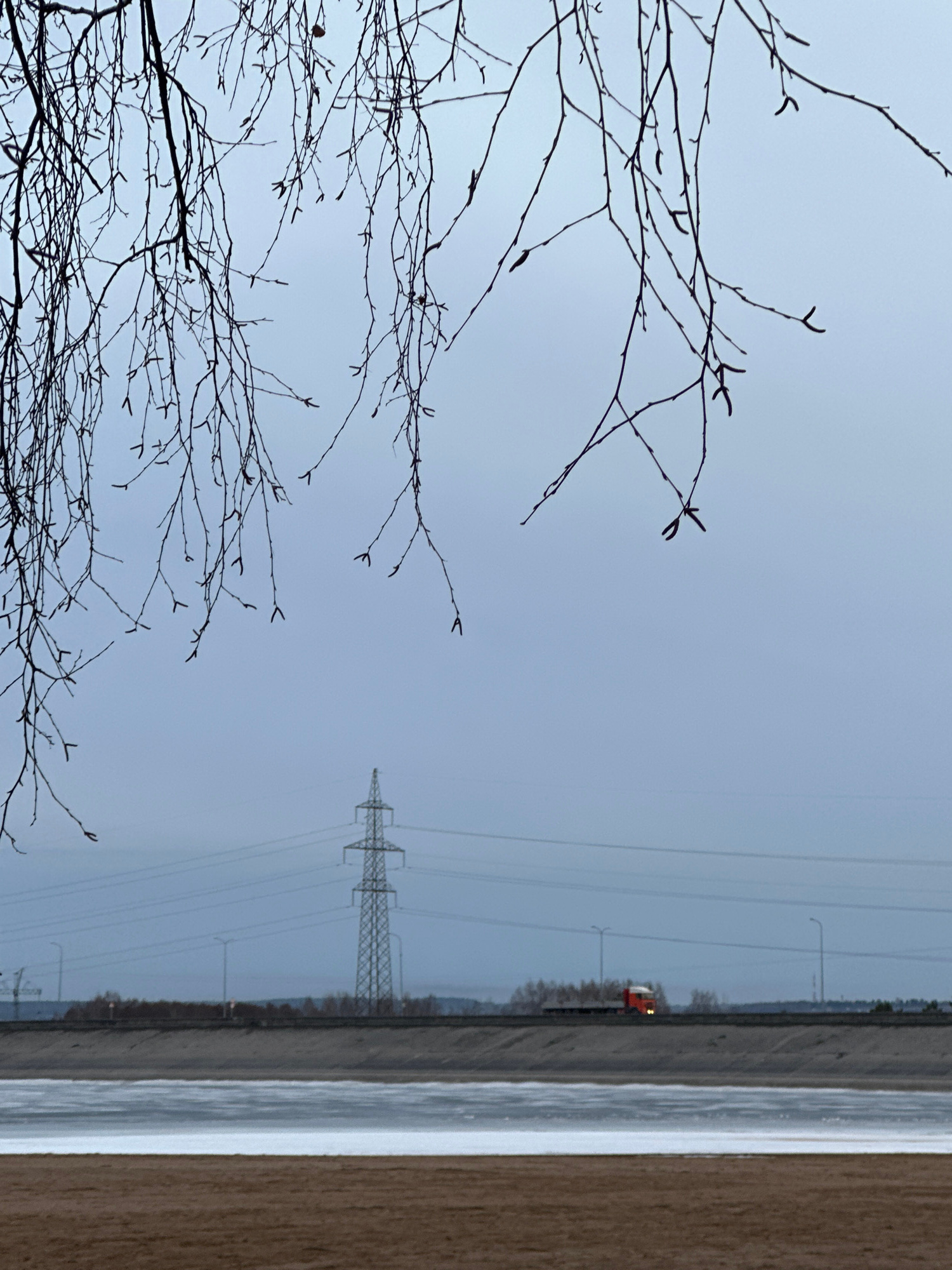The image presents a winter scene. In the foreground are bare tree branches against a grey sky. To the right, a snow-covered ground runs alongside a road where a red vehicle is visible. Further in the…read more