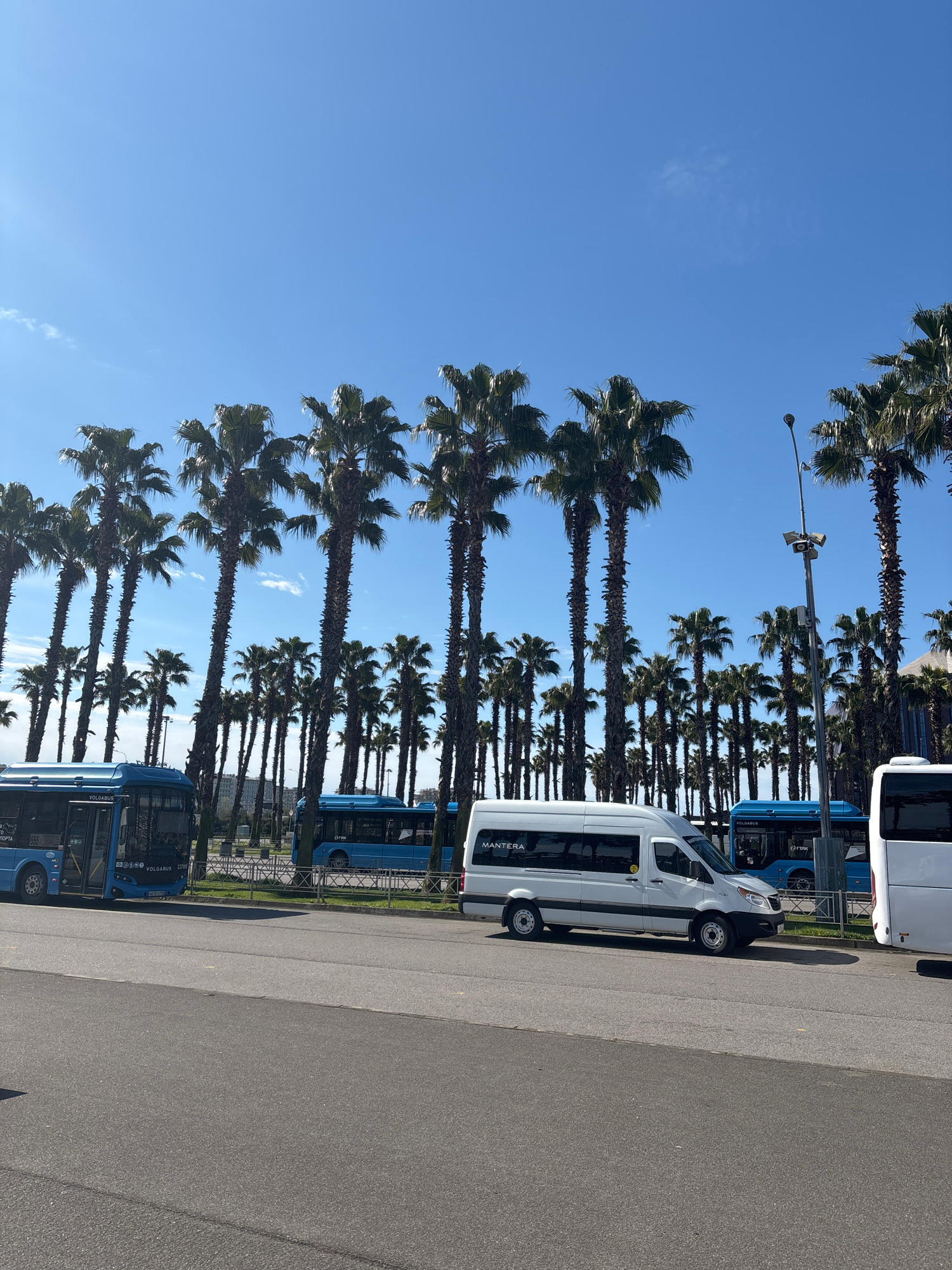 The scene depicts a row of palm trees lining a road in what is presumed to be the city of Sirius, Russia. Blue buses and white vans are parked along the roadside. The sky is clear and blue. A lamppost…read more
