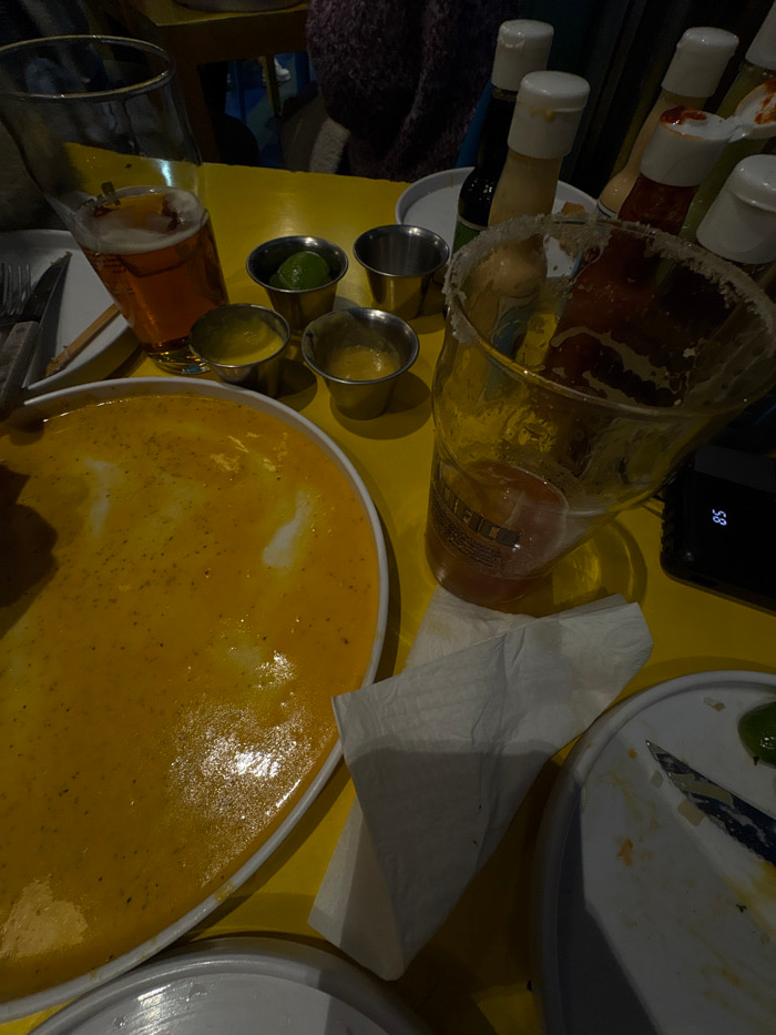 An overhead shot captures a messy, yellow table setting after a meal. A large, mostly empty plate of yellow food dominates the scene, accompanied by condiment bottles and small metal ramekins. A salt-…read more