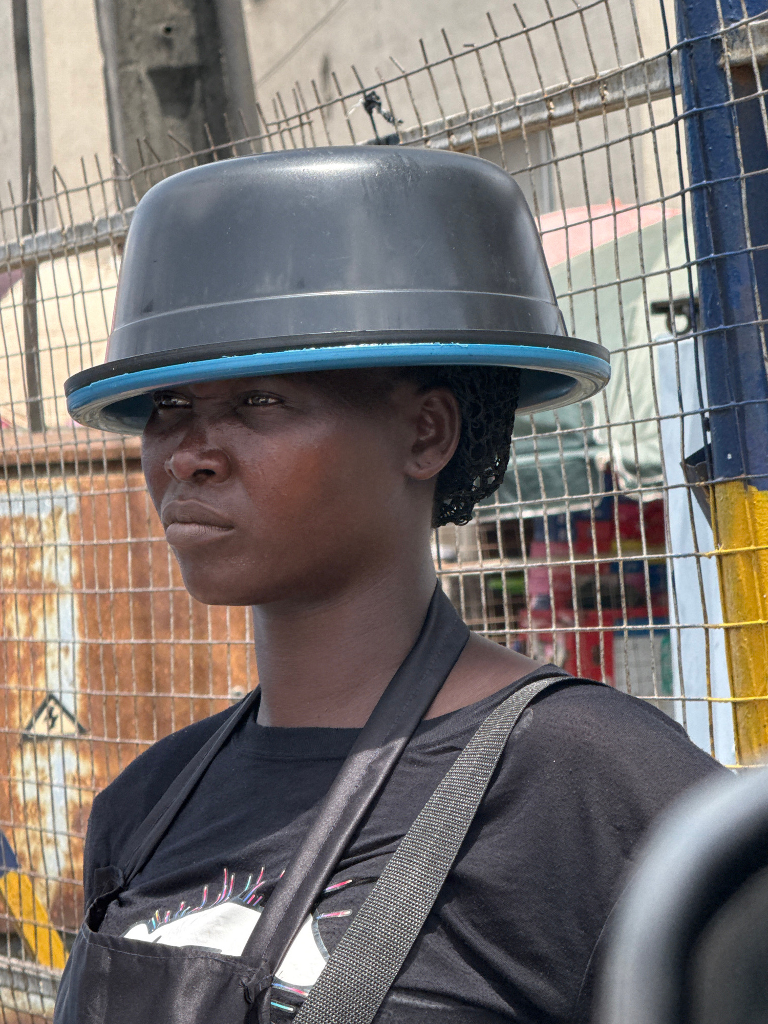 A woman in Lagos, Nigeria, wears a large gray plastic bucket on her head. The bucket has a blue rim. She is wearing a black t-shirt and a gray strap is slung over her shoulder. She is standing in fron…read more