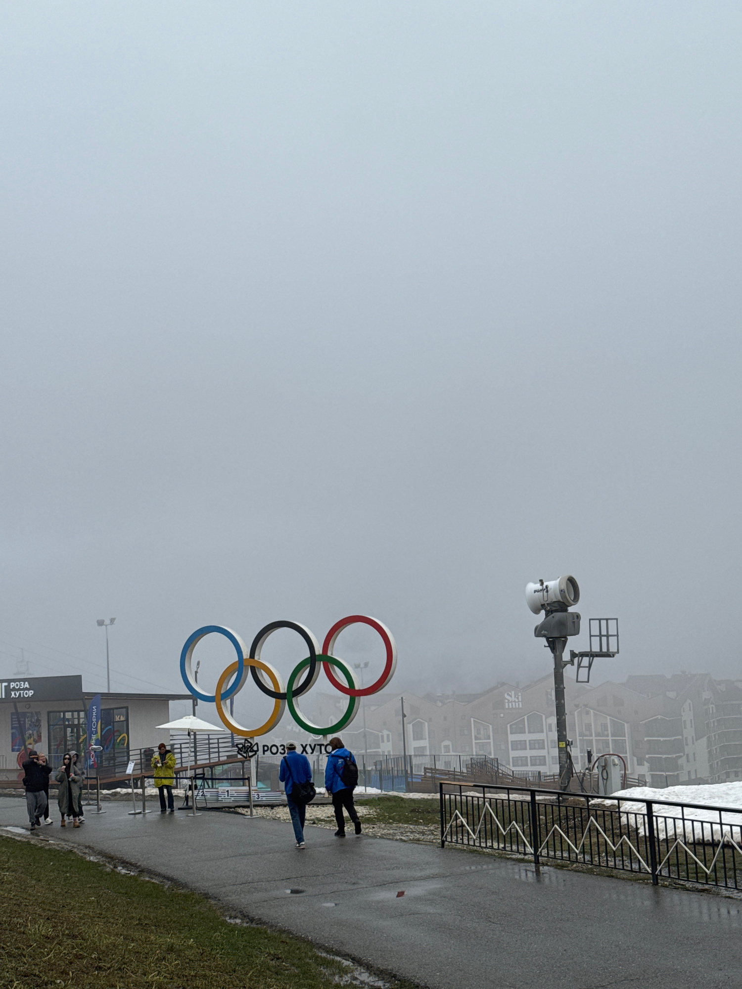 The image shows the Olympic rings in Sochi, Russia, on a foggy day. Two people are walking along a paved path next to the rings. Several people are standing in front of a building at the base of the r…read more
